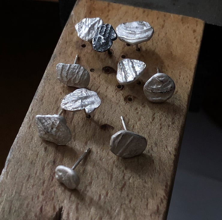 All of my recycled silver products are created by melting down scrap material from other projects so each one is completely unique. These individual studs have been melted and cast into a charcoal block to create a unique organic texture.