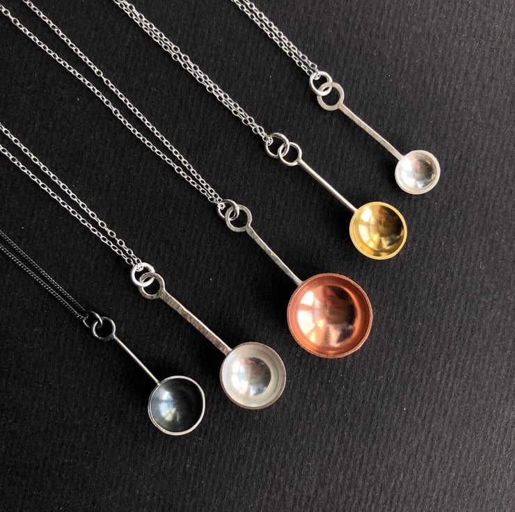My spoon pendants and abstract spoon pendants are all inspired by my collection of spoons. I create all of my spoon jewellery from silver wire and sheet, hand formed and soldered together.