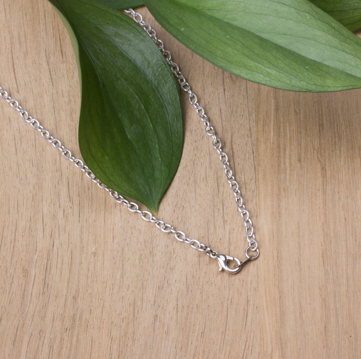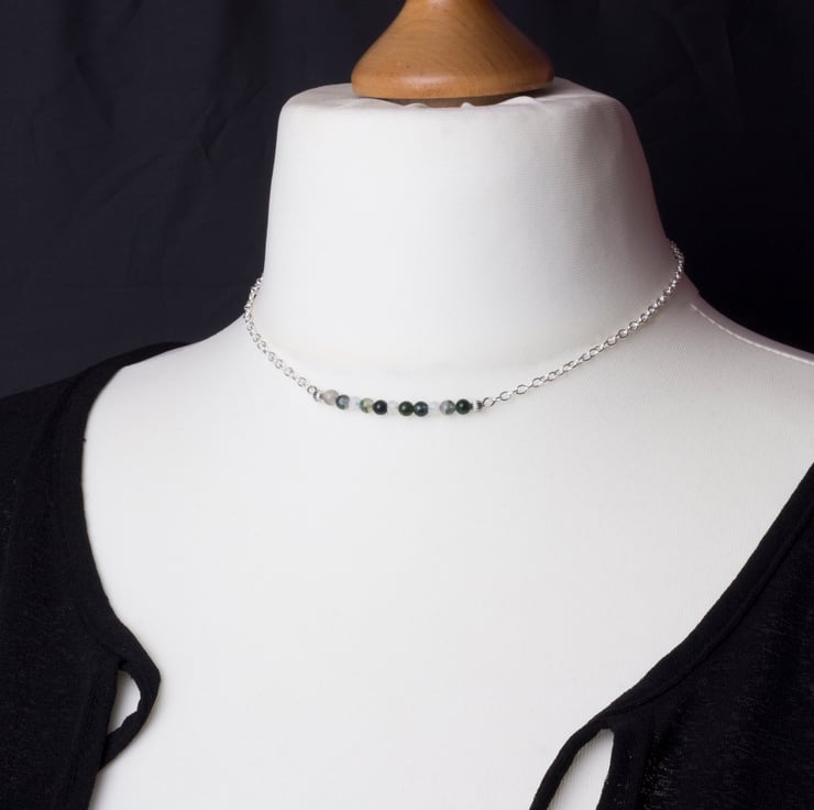 This necklace features a beautiful row of small green moss agate gemstones, complemented by opalite faceted glass and Tibetan silver beads. The gemstones are situated on a silver tone cable link chain, measuring approximately 16 inches in length. The necklace is finished with a silver tone lobster clasp and is handmade in the UK. This item is currently in stock and ready to be shipped.