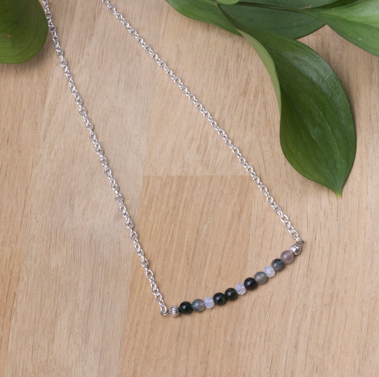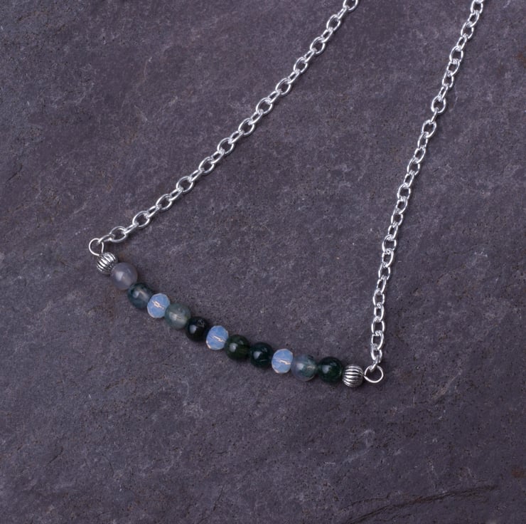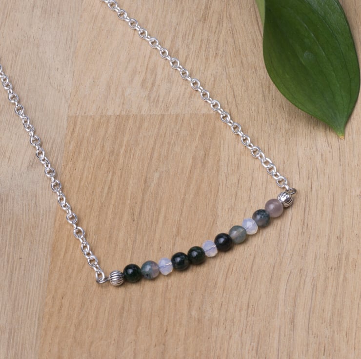 Green Moss Agate bar necklace - Small gemstone and opalite bead 16 inch necklace