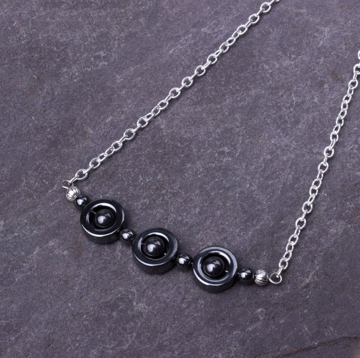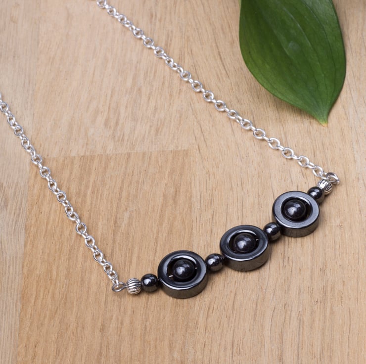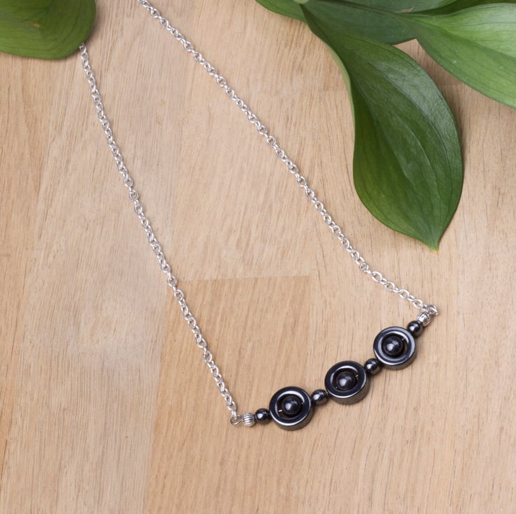 This is a beautiful silver necklace featuring a simple gemstone bar. It has a row of three Hematite rings that are adorned with Hematite and Tibetan silver beads, which sit at the centre of a silver tone cable link chain. The necklace measures approximately 16 inches in length and is finished with a silver tone lobster clasp. This piece is handmade in the UK and is currently in stock and ready to ship.