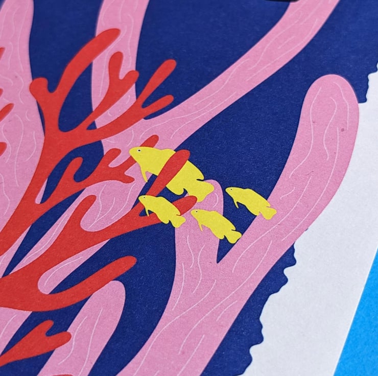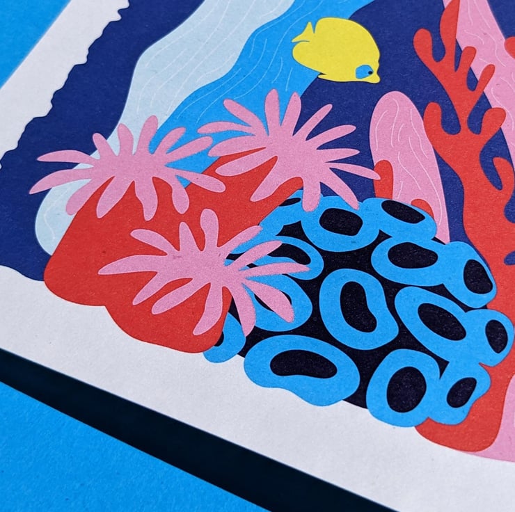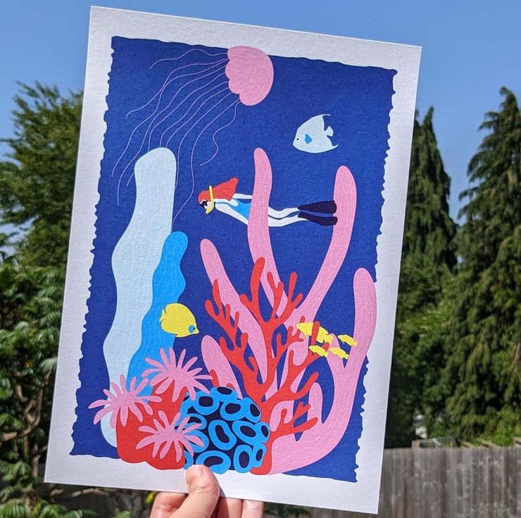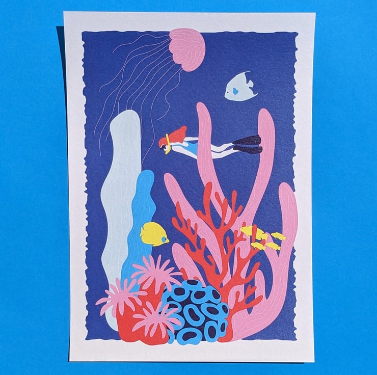 A vibrant art print of a beautiful coral reef and scuba diver illustrated in bright blue, red, pink and yellow.