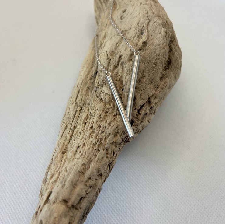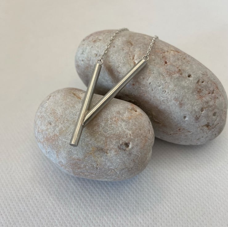 This striking pendant consists of two lengths of 3mm sterling silver wire which is joined together at an angle, creating an abstract shape.