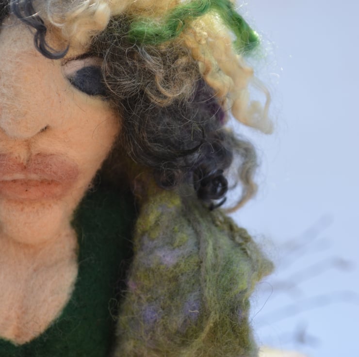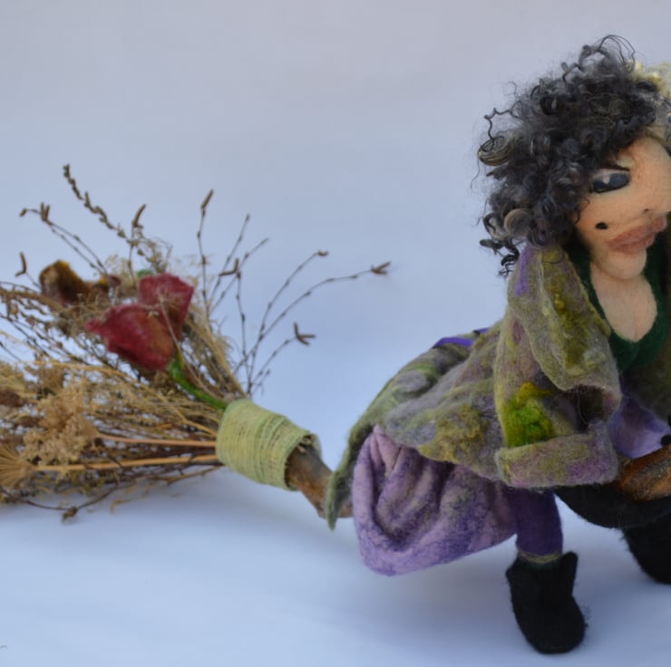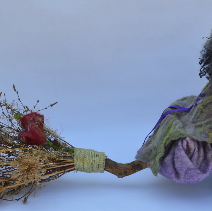 This Glamorous witch is handmade using Merino, British wools, Bamboos, Silks and Wool locks. She sits upon a Twisted Willow and wild flower broomstick, harvested from our garden and local country park.
