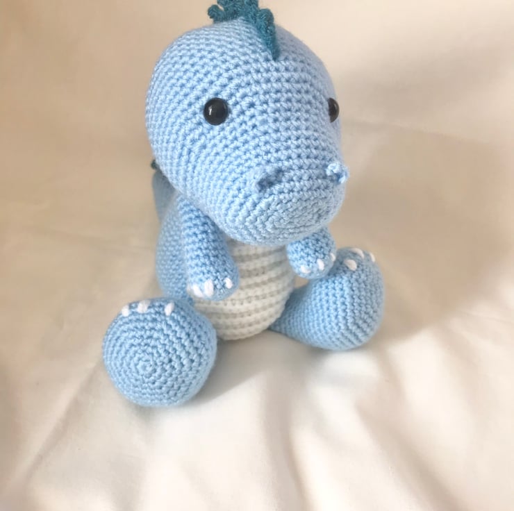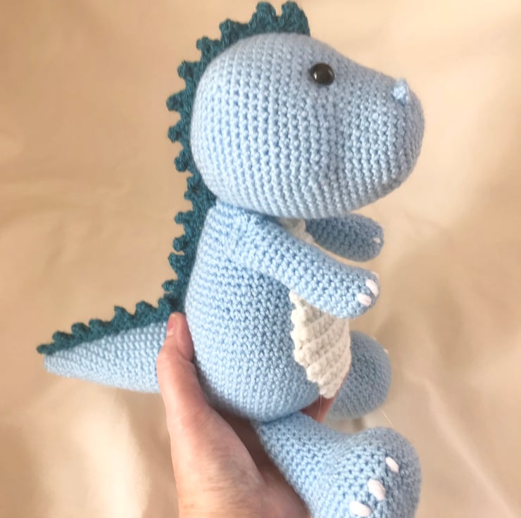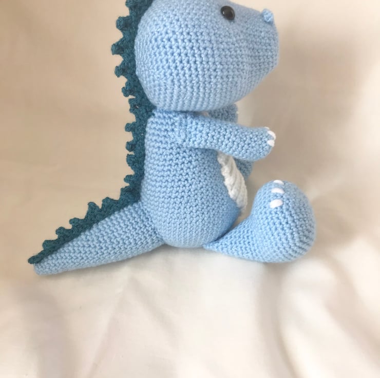 This T-rex dinosaur is handmade with blue acrylic yarn with plastic safety eyes and polyester stuffing. He measures approx. H19 x 20L x 14W cm.