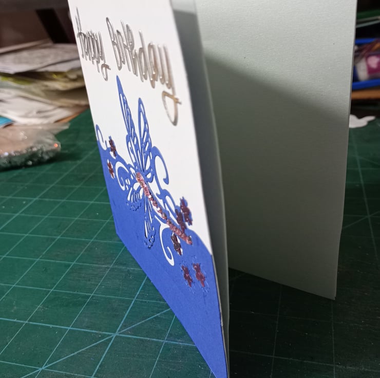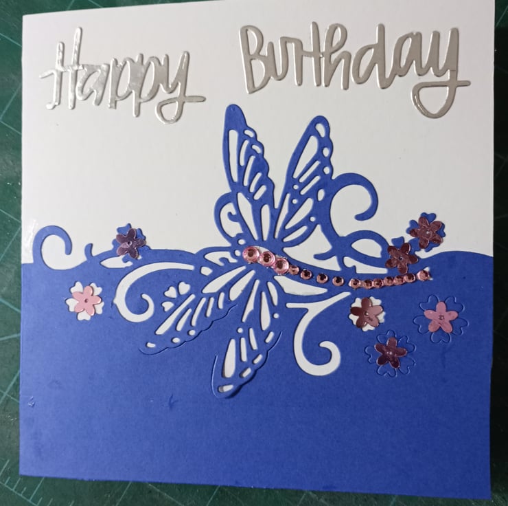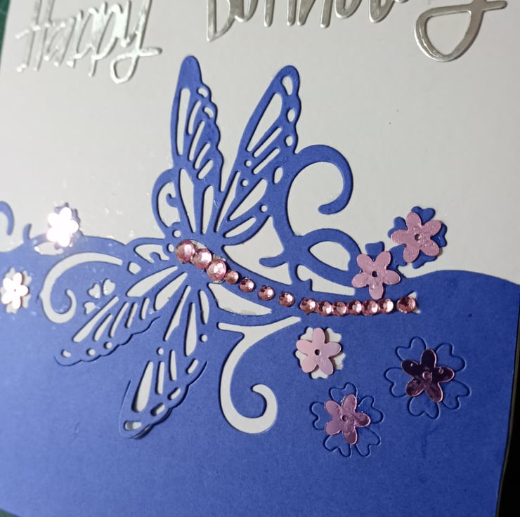 A completely handmade and uniquely designed card. Consisting of a dragonfly mounted onto pristine white quality card. Embellished with pink rhinestones and pink flower sequins. Finished off with happy birthday due cut from silver mirror cardice white pearl paper insert which has been left blank for your own personal message