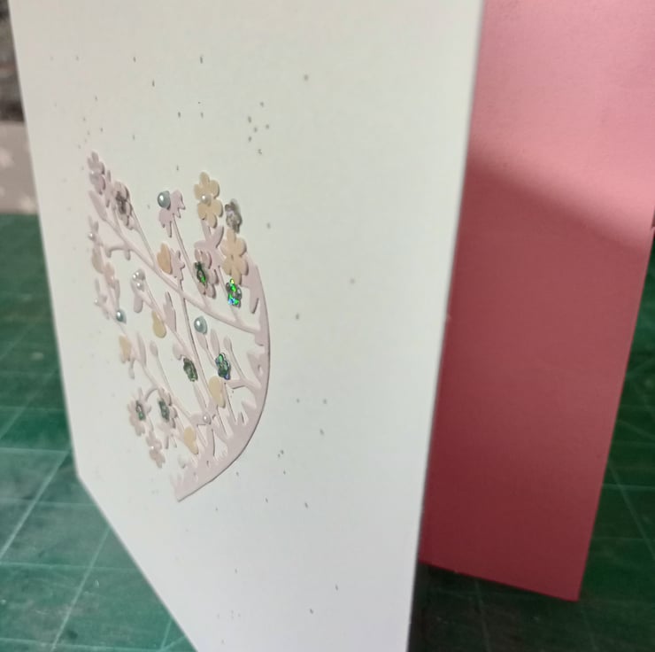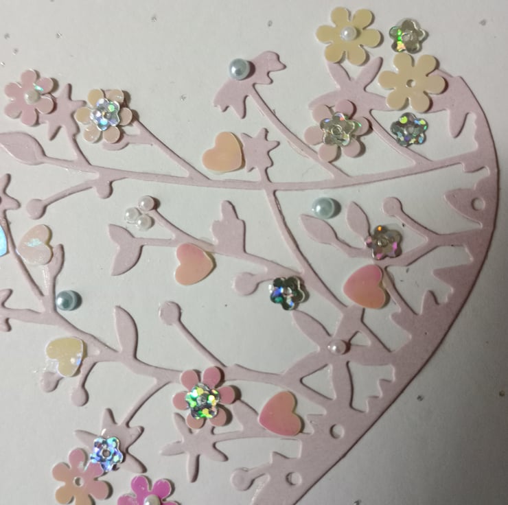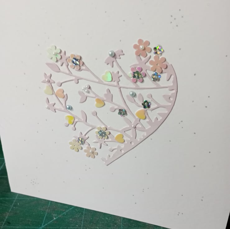 A completely handmade and uniquely designed card. Consisting of a pretty floral heart due cut from pink shaded card. Mounted onto quality pristine white card. Embellished with heart sequins, silver flower sequins, pearl beads.