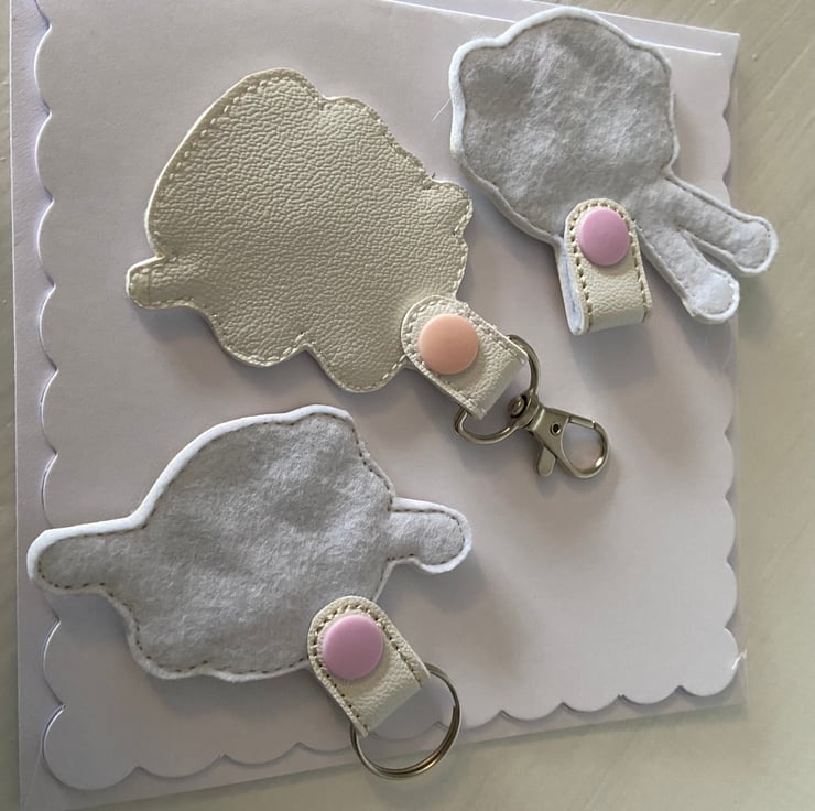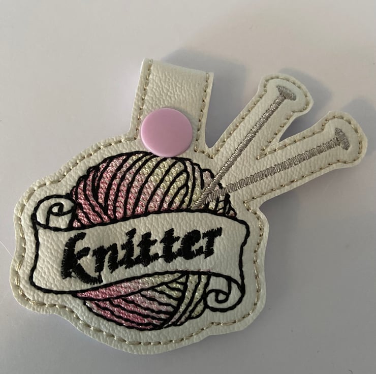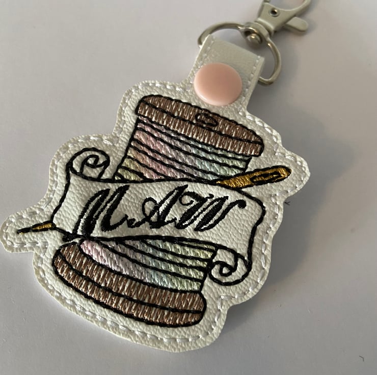 Stitched onto cream faux leather and finished with a kam snap pop fastener and a metal ring.