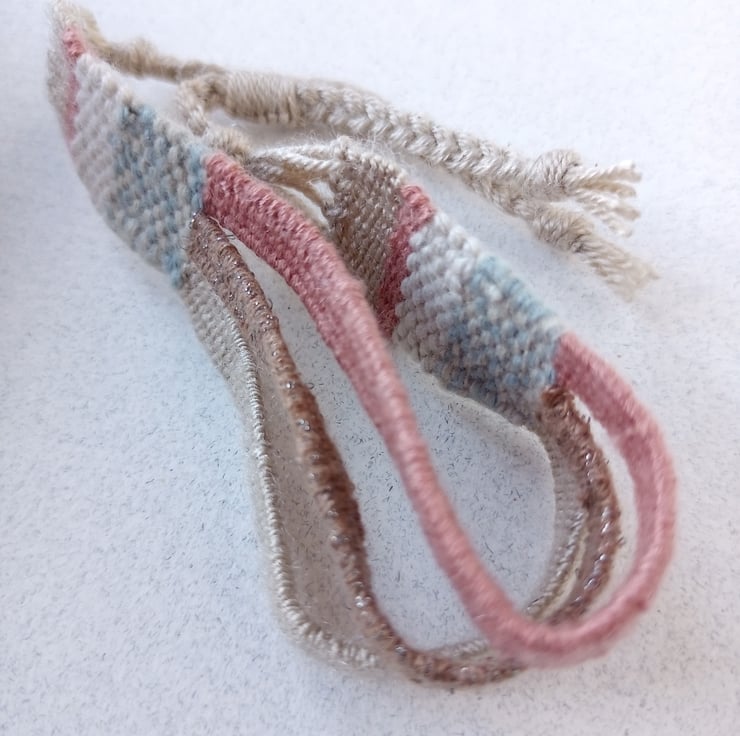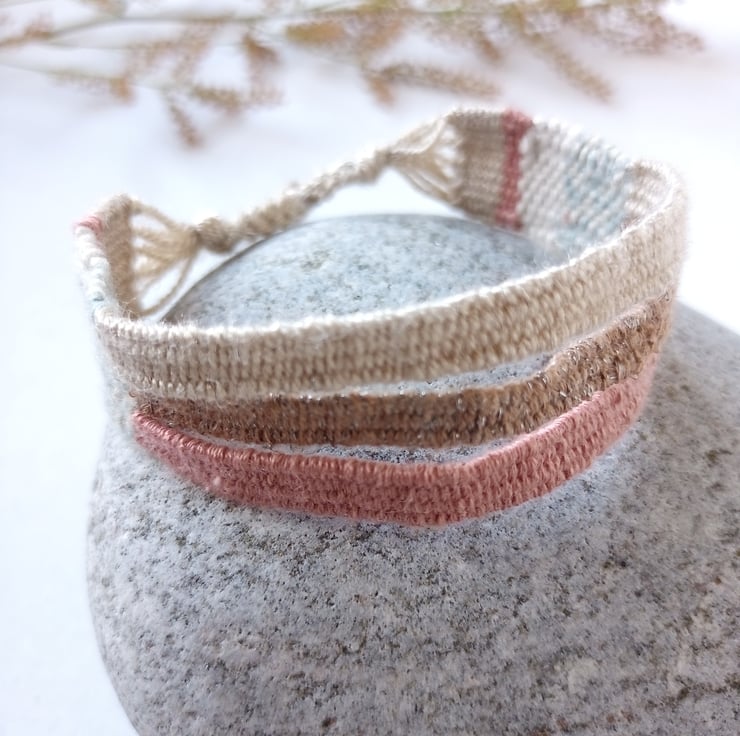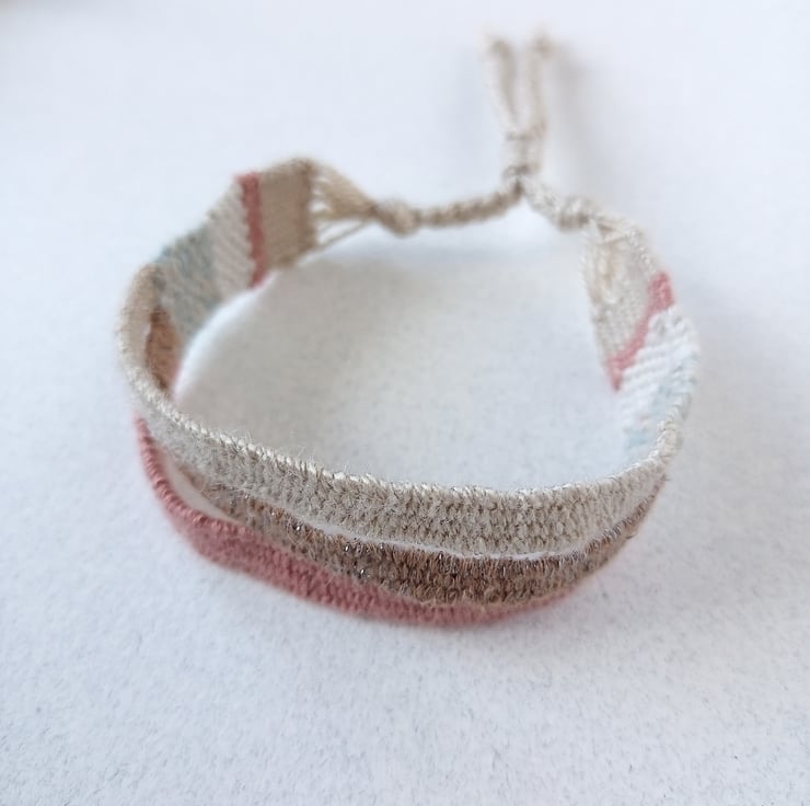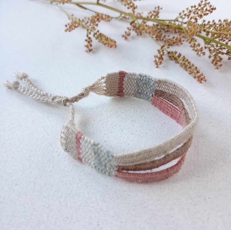 This gorgeous friendship bracelet has been lovingly woven on a small hand loom using cotton yarns in a palette of dusky peach, coffee and beige.