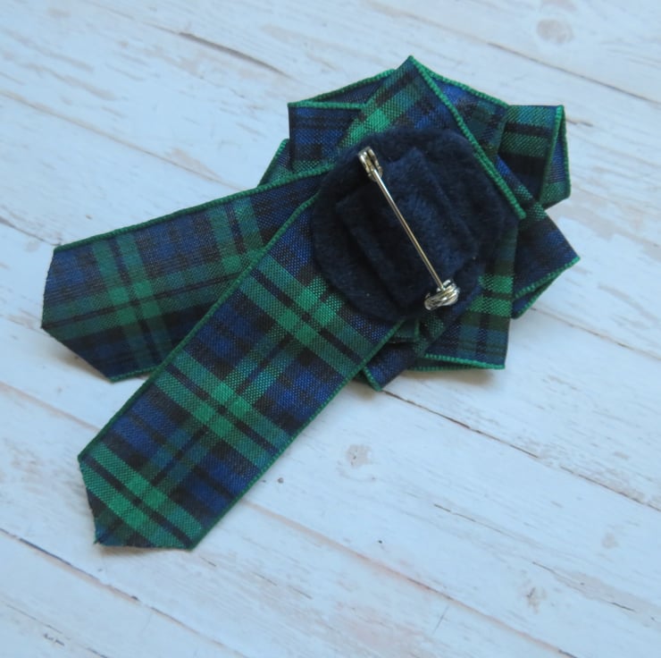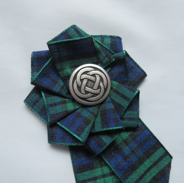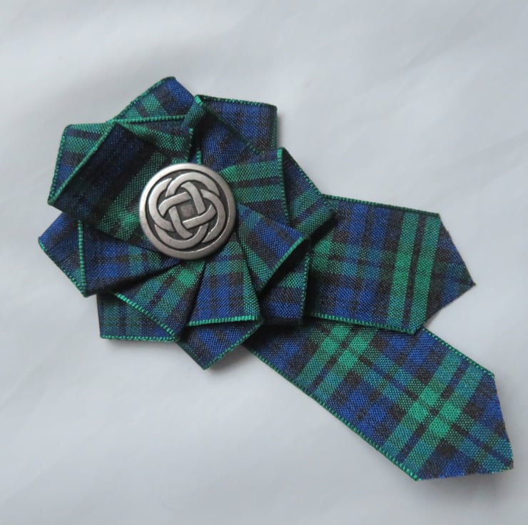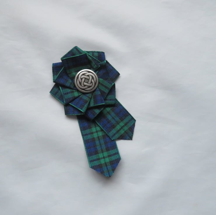 Made with a small circle of navy blue felt with a small brooch pin attached and a handmade and sewn ruffle of Black Watch tartan ribbon with wide ribbon shaped trails and finished with a silver Celtic button.