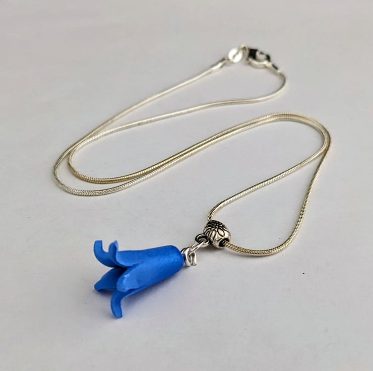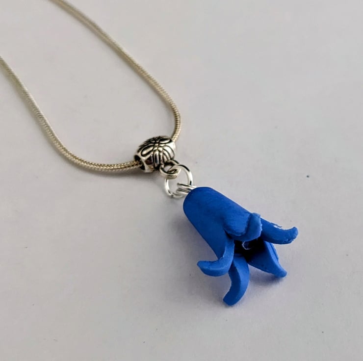 15mm bluebell made of polymer clay, on an 18" silver plated snake chain with lobster clasp fastening.