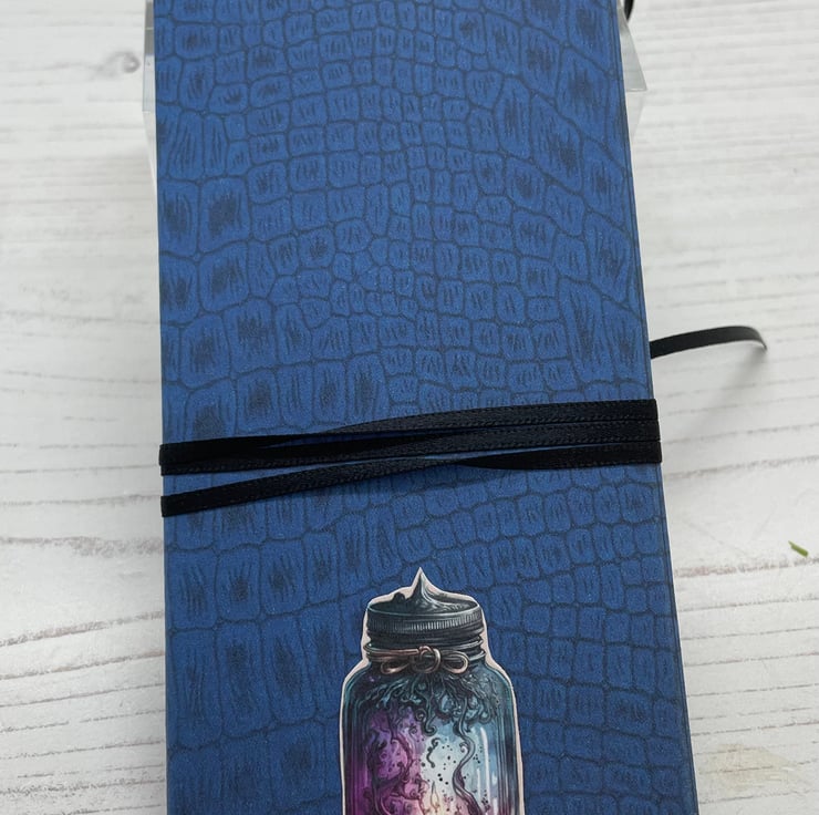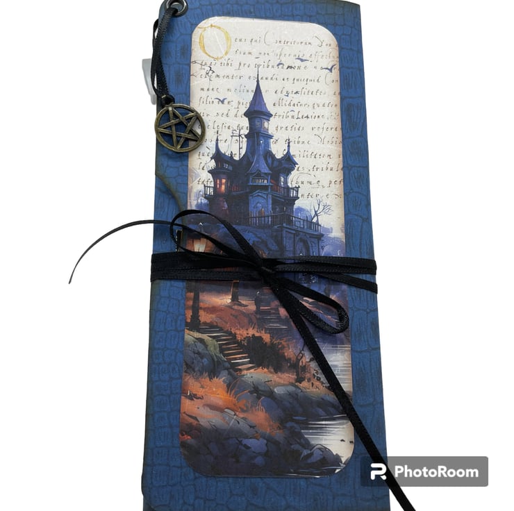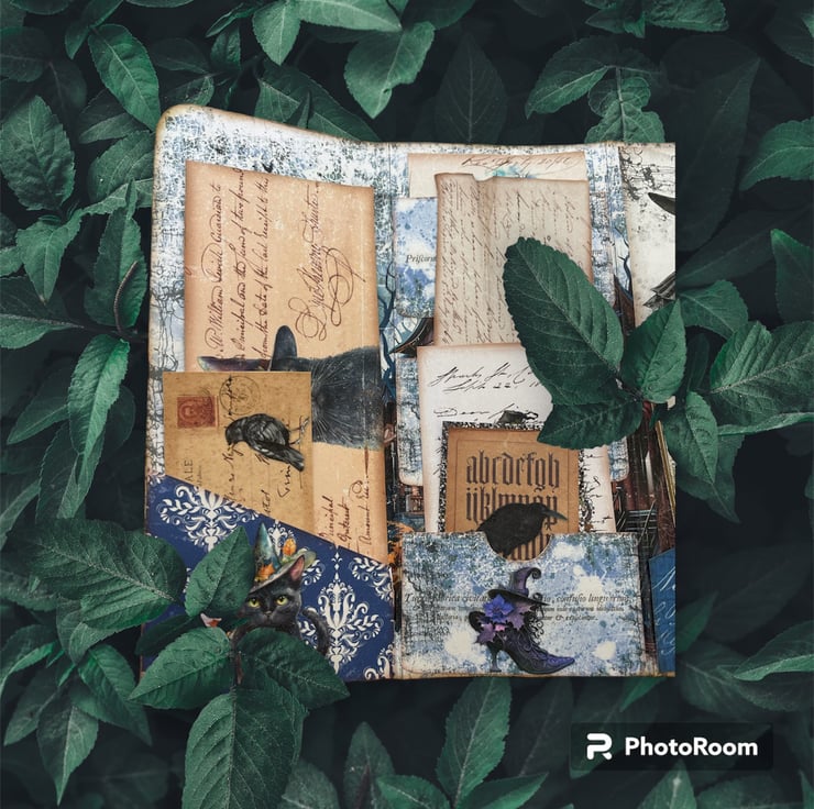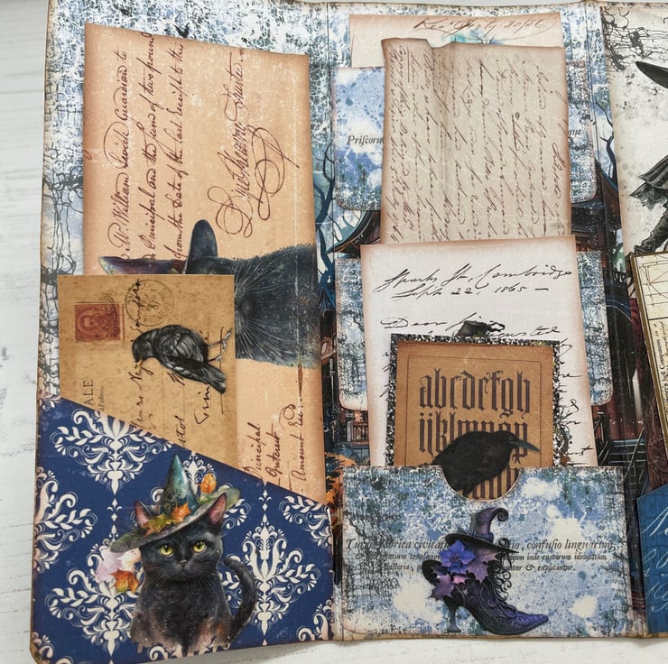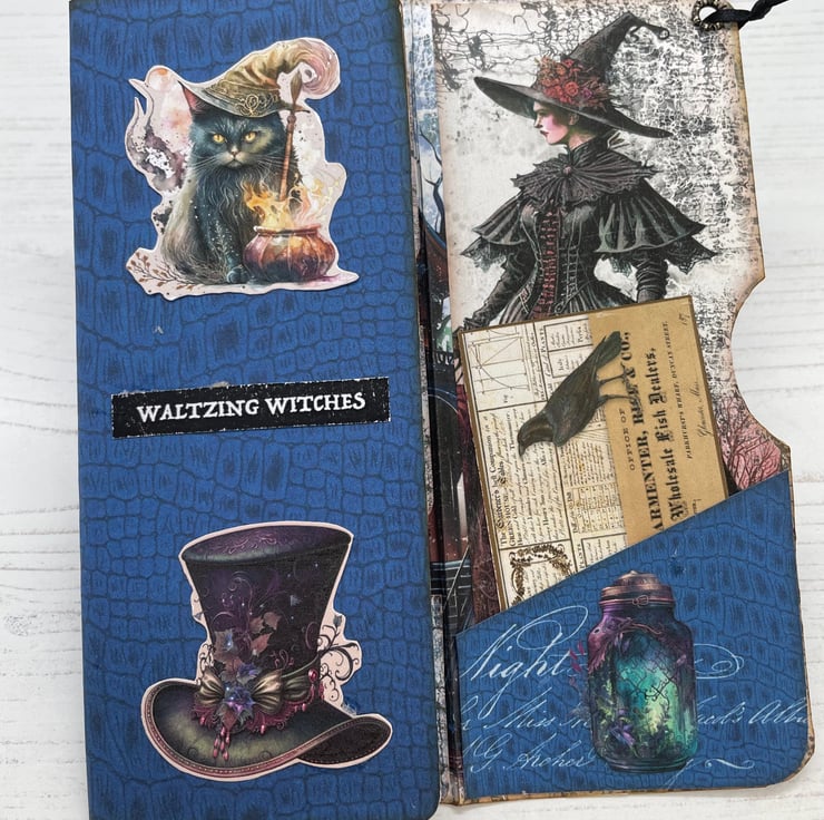 A 2 fold folder for Halloween. Outer cover has a spooky house image, apothecary bottle in the back and fussy cut images of a black cat, top hat and words ‘Waltzing Witches’. Pocket on the inside front cover, trio of pockets in the centre and a double pocket on back inside cover. Tags and journal cards included.