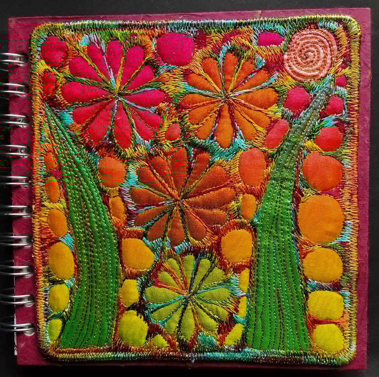The cover is made from layers of fabric including hand dyed Egyptian cotton and silk fabrics using the free machine embroidery style of sewing