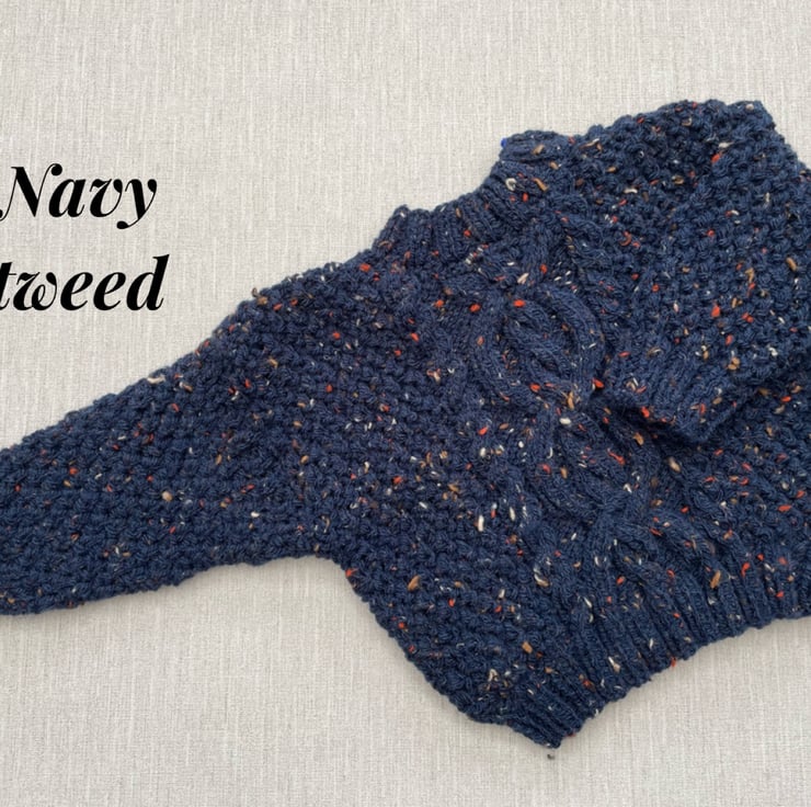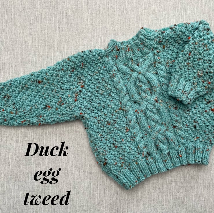 These hand knitted sweaters have been knitted in a super soft 20% wool mix Aran yarn which makes it gentle next to babies delicate skin.