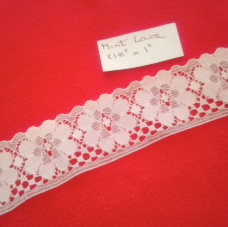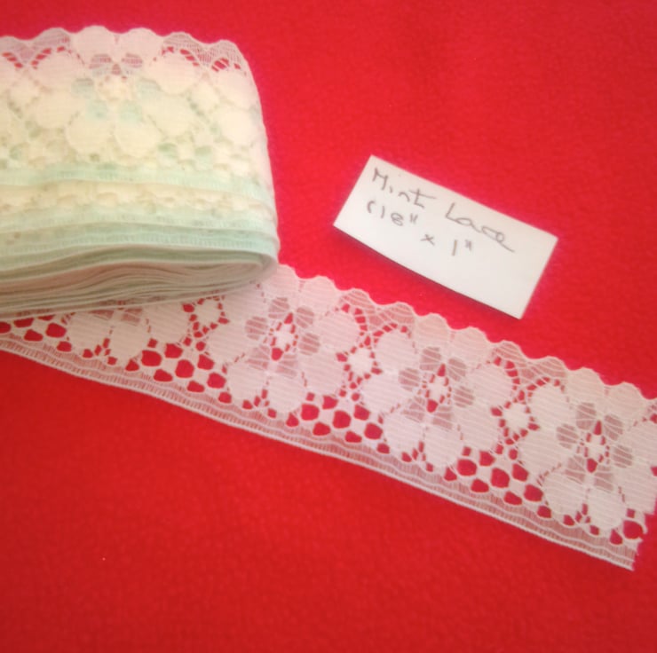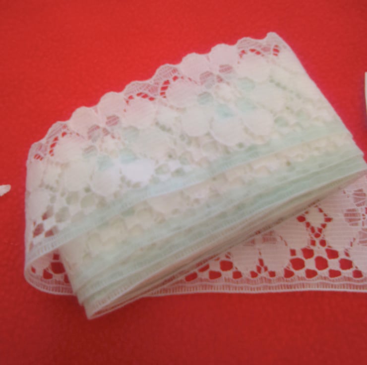 A strip of pretty pale mint vintage lace trim, perfect for crafting projects.