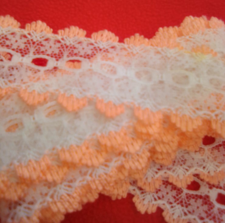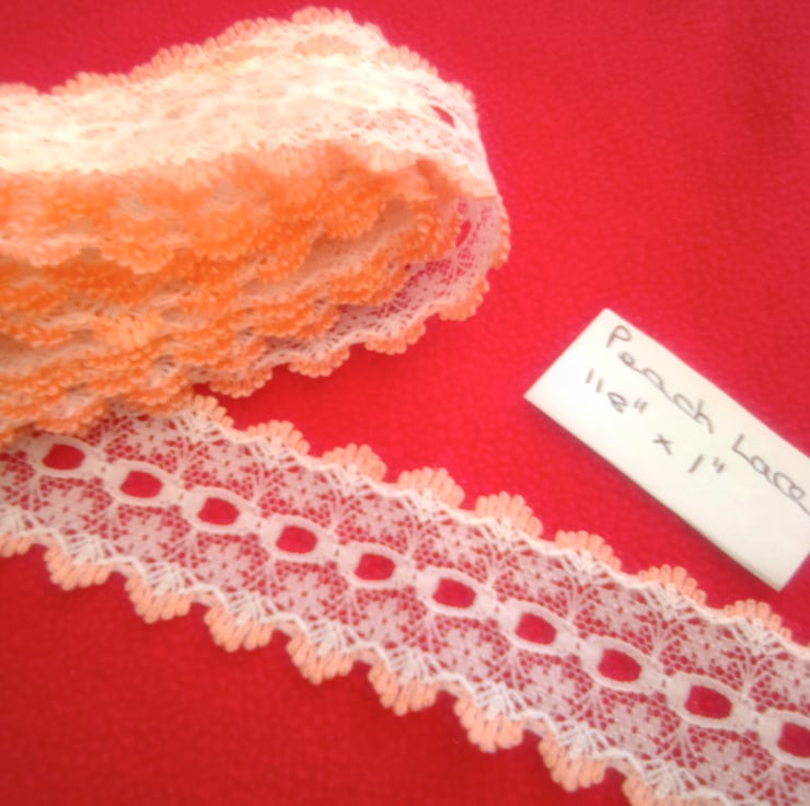 A strip of pretty peach vintage lace trim, perfect for crafting projects.