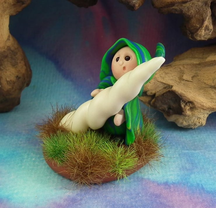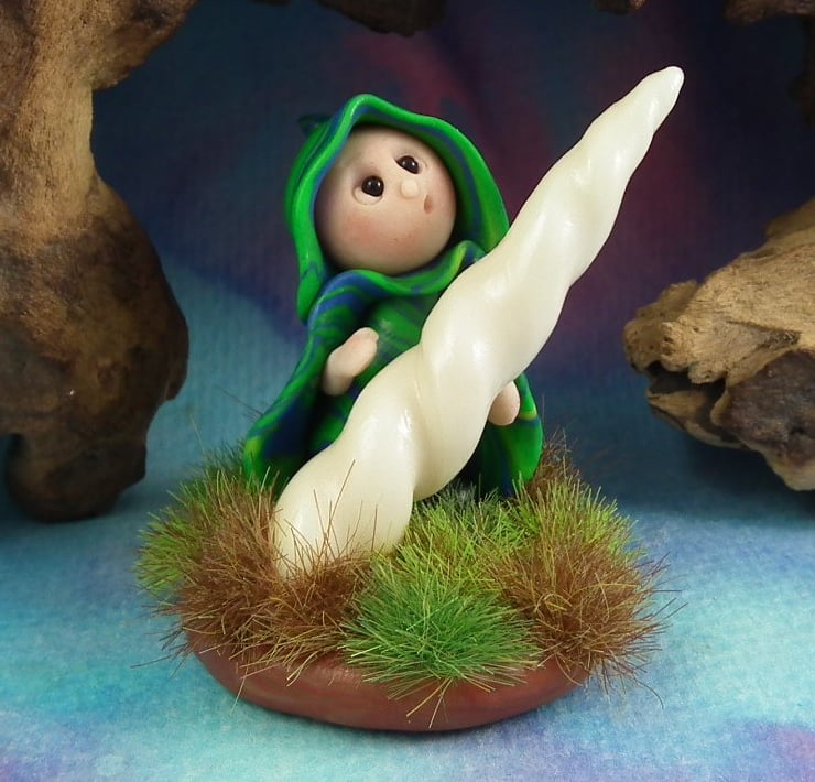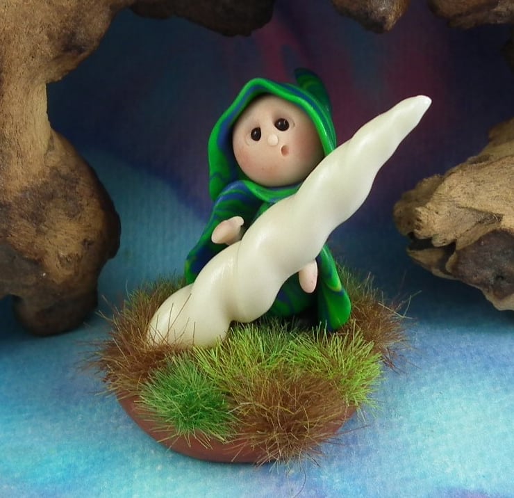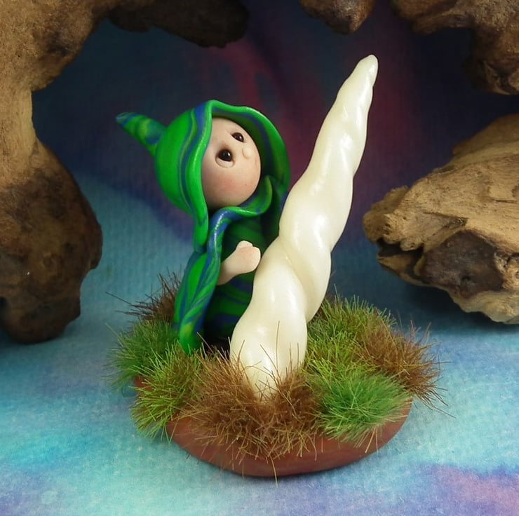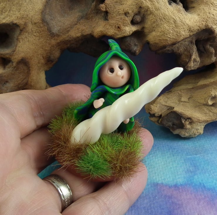 This is a 'one of a kind' creation having been entirely handmade without the use of moulds here at my studio on the Sussex Coast. Modelled with artist blend polymers, blushed before sealing with lacquer, Flikka has sparkling black onyx eyes and variegated robes. Flikka the Magical Gnome is just one and a half inches tall, fixed on mossy base.