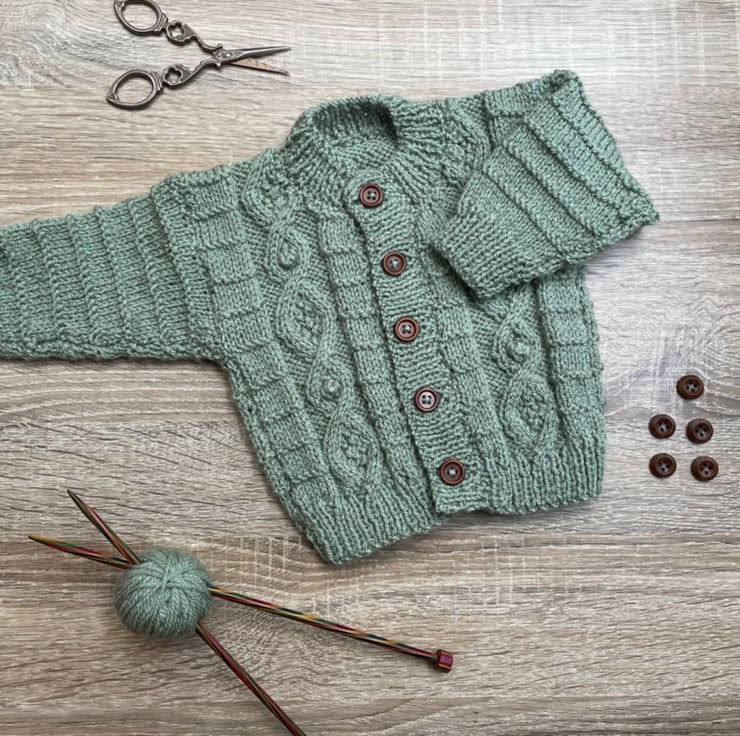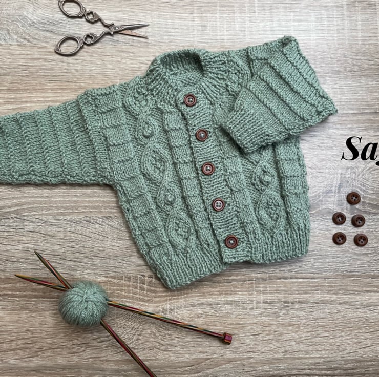 A beautiful hand knitted baby cardigan to fit 0-3 months of age baby.