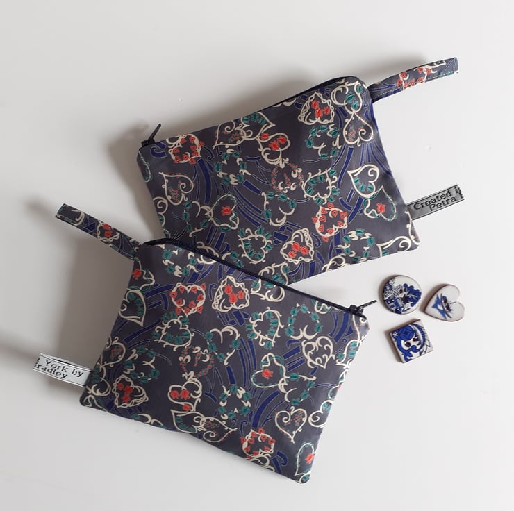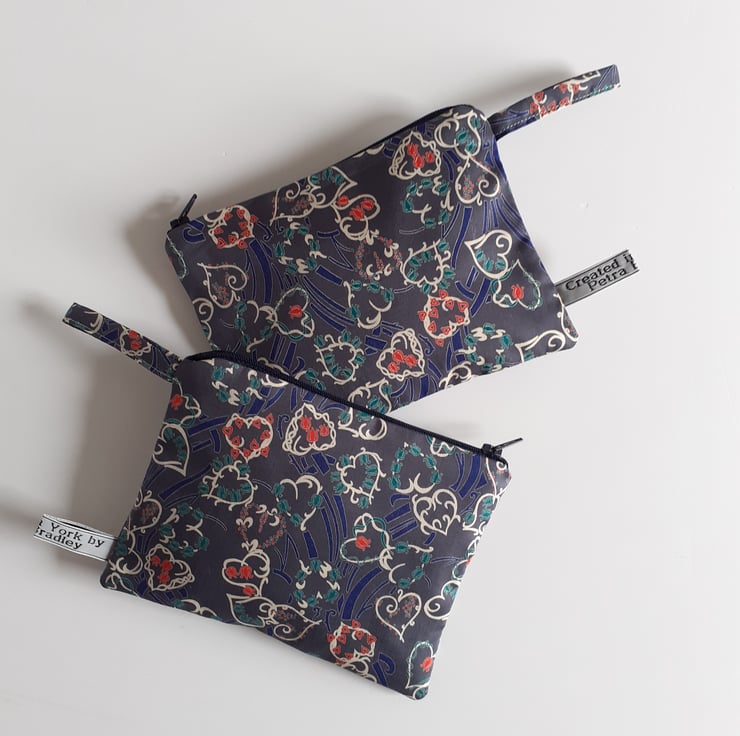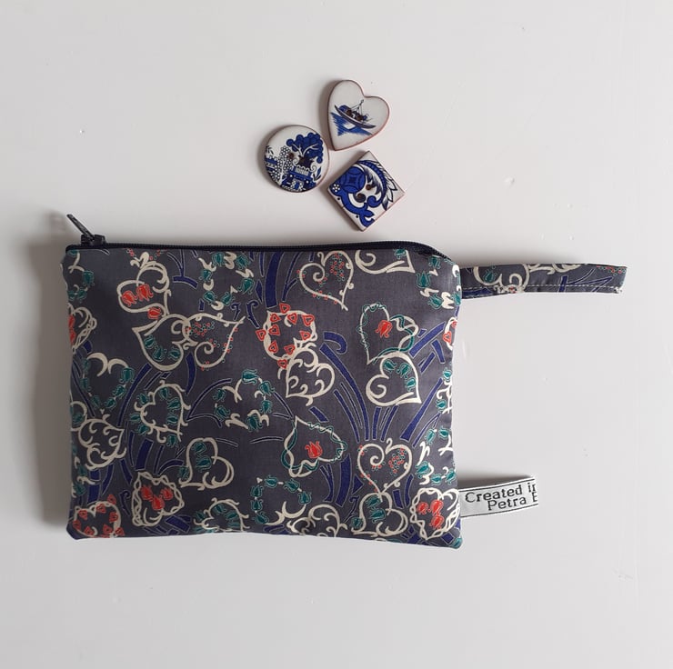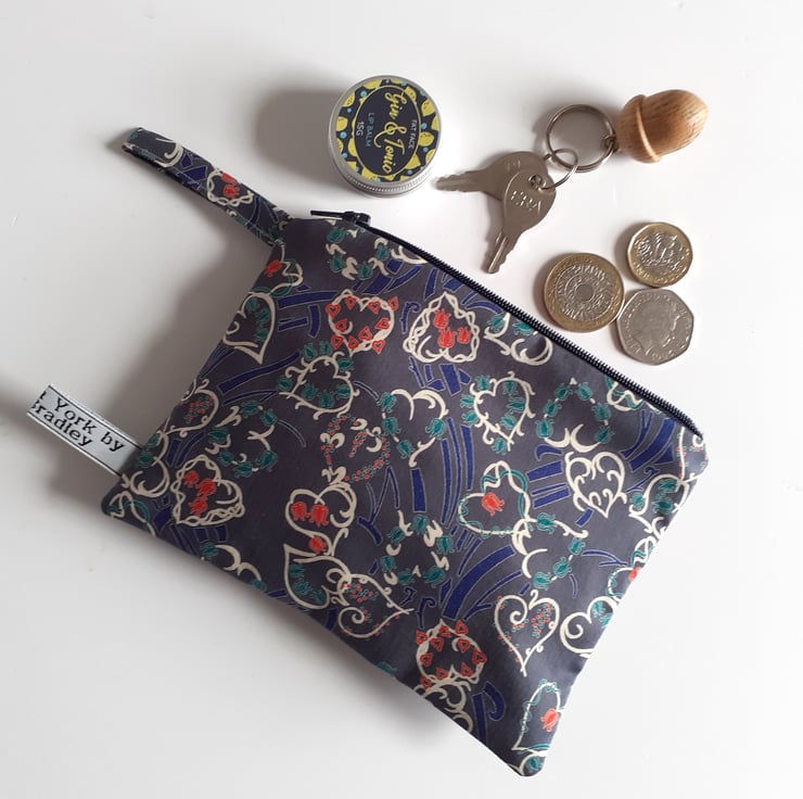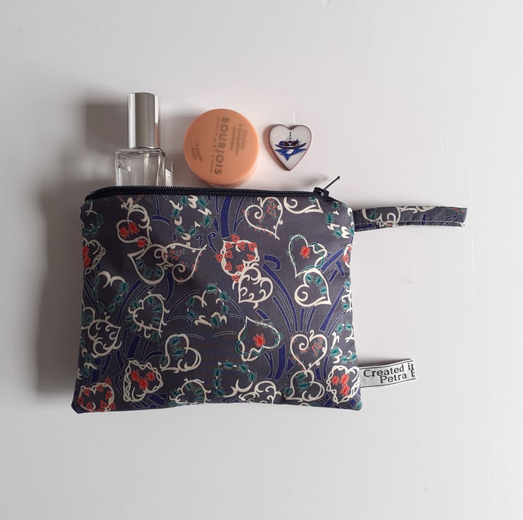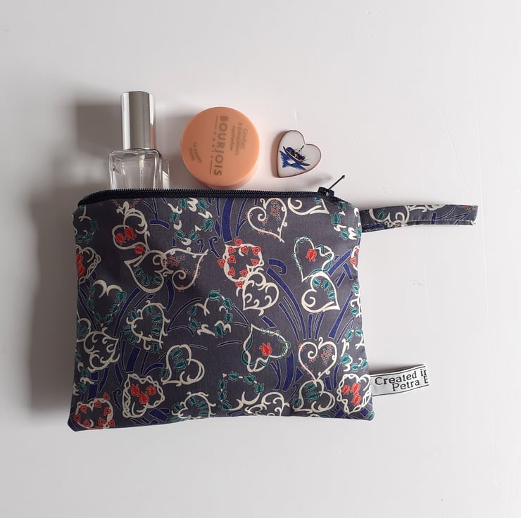 A sweet purse or make up bag in a print with hearts by Liberty. I love its hand drawn style and muted colour combinations. Perfect for use as a coin purse, make up bag or simply as a floating pocket, to catch the bits and bats that swirl around inside your tote bag. This would make a lovely summer Birthday present or a going to Uni present.