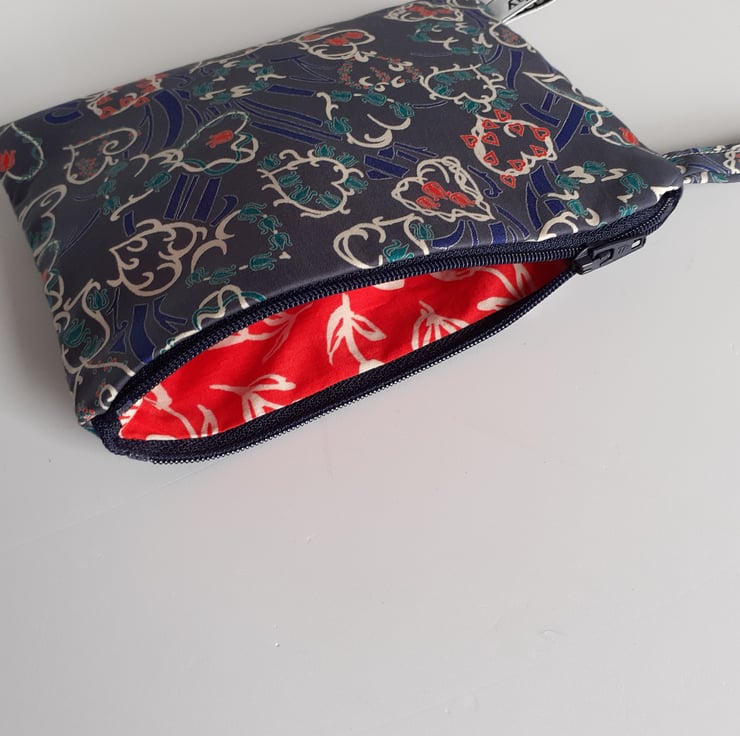 The lining is a bright orange vintage print, and there is a navy zip opening measuring 16 cm
