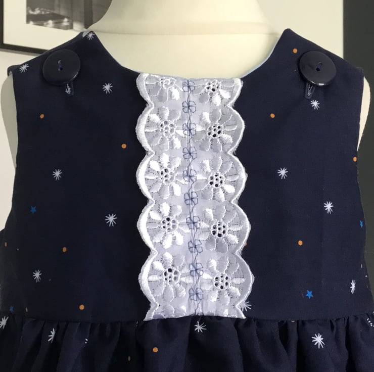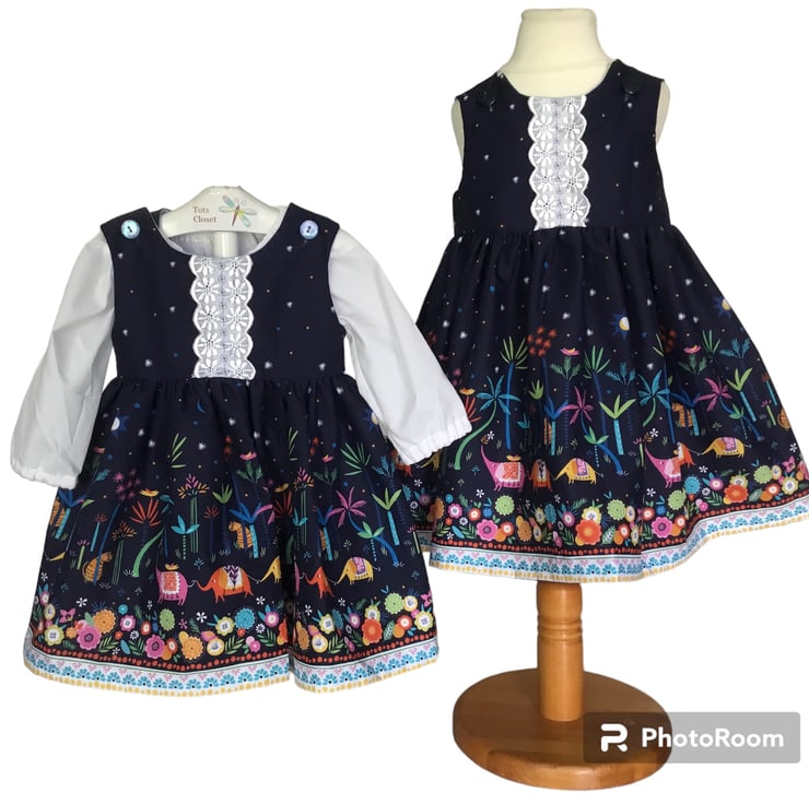 Navy baby dress in lovely border print which has fun animals at the hem. The top is fully lined and fastens at the shoulder with button for easy dressing . There is a sash attached to the waist which can tighten dress if needed.