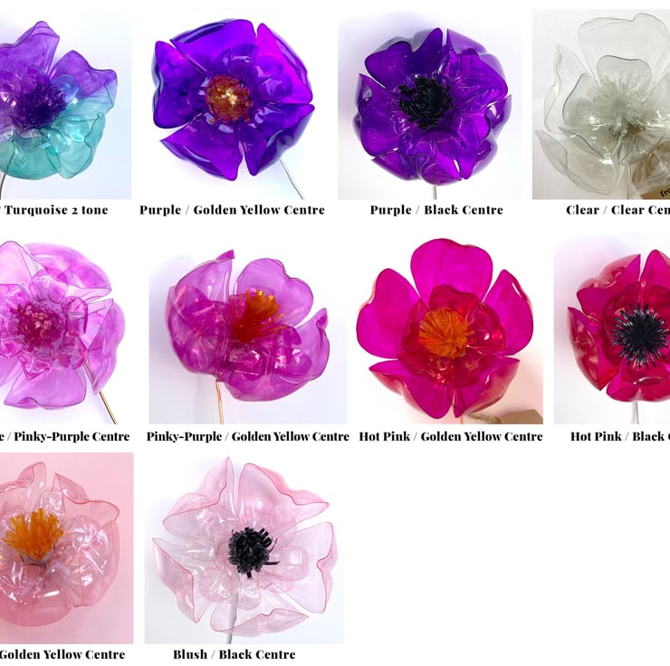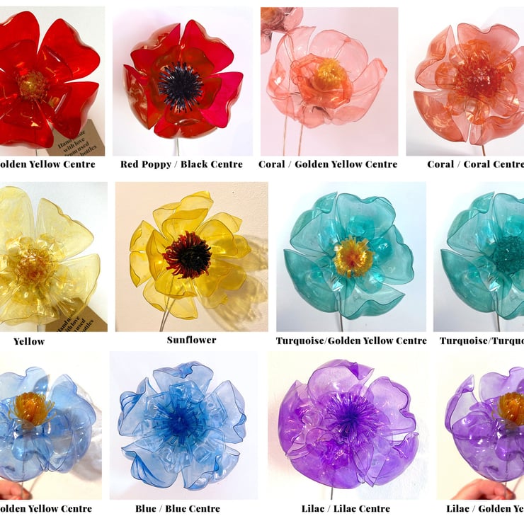 I collect used and littered plastic bottles which I cut and shape by hand and colour using home made dyes. The aluminium wire stems can be bent and flexed into the perfect position and trimmed with scissors if needed.