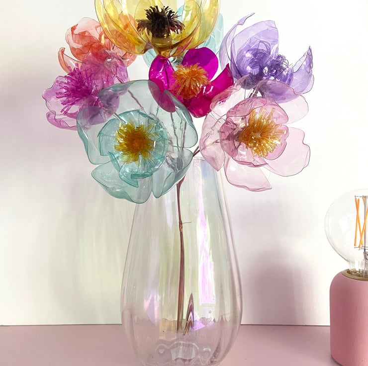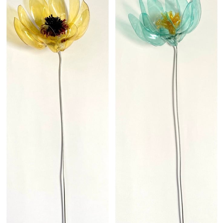 I collect used and littered plastic bottles which I cut and shape by hand and colour using home made dyes. The aluminium wire stems can be bent and flexed into the perfect position and trimmed with scissors if needed.