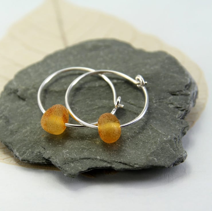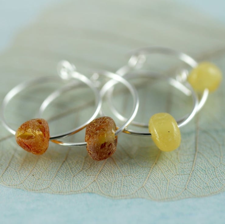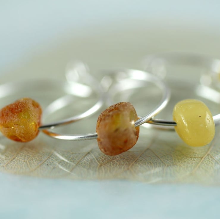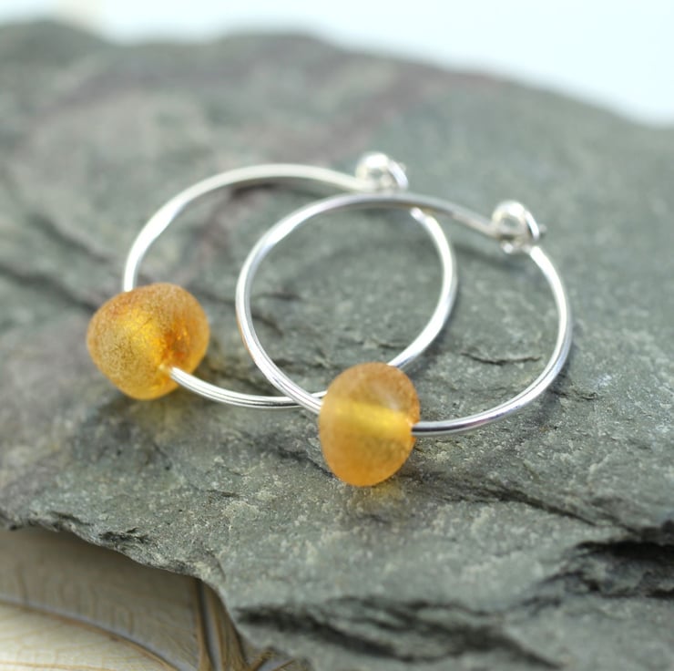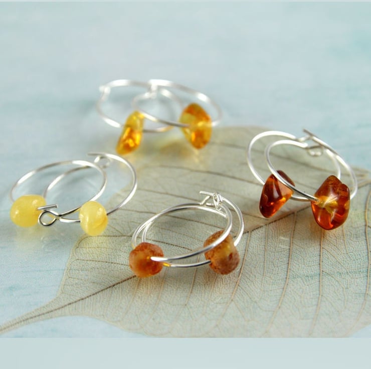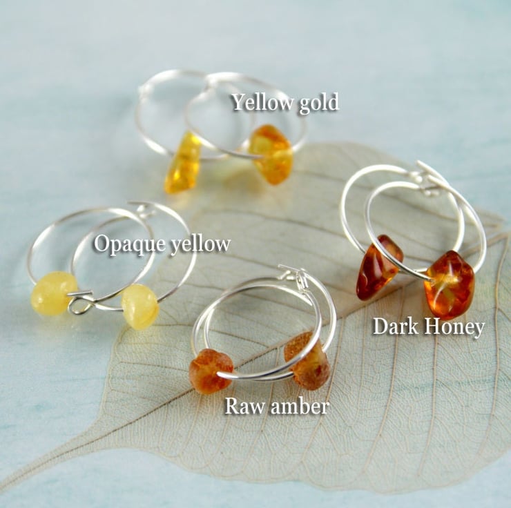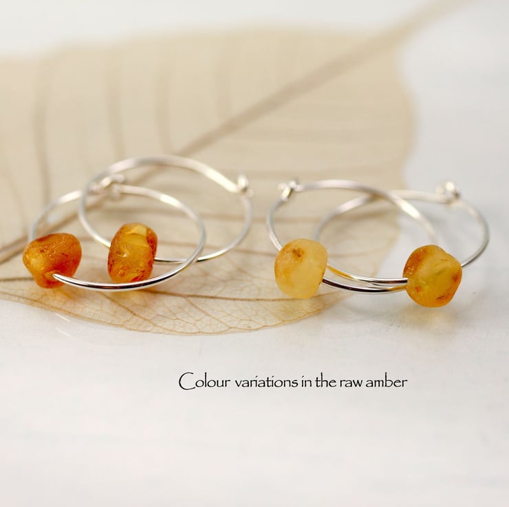 This pair is adorned with golden Baltic amber nuggets moving freely in the hoop.