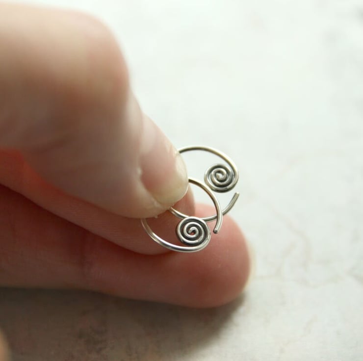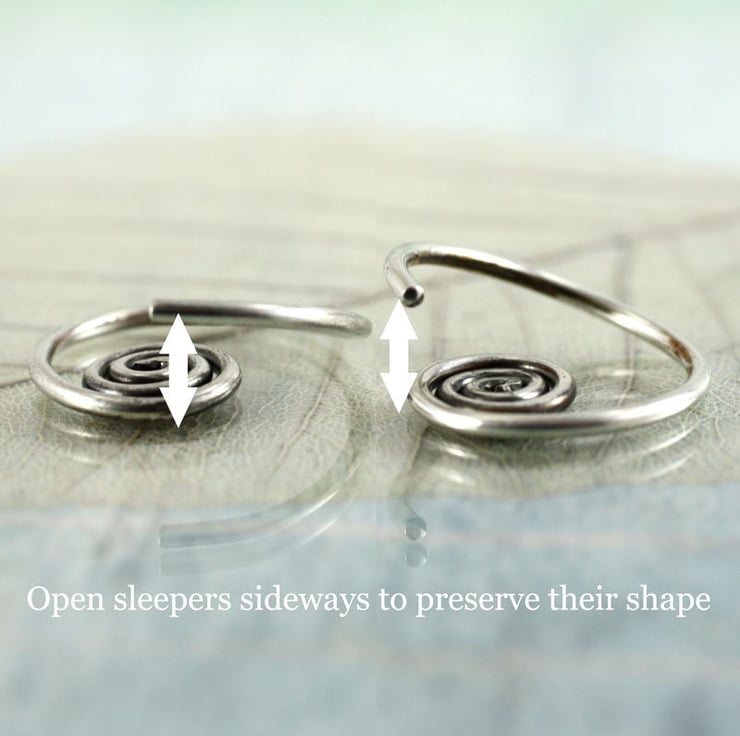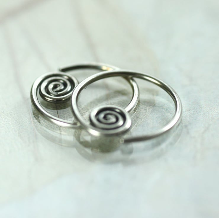 I made them with sterling silver wire, polished them, oxidised them to bring out the detail in the spiral, then polished them a final time.