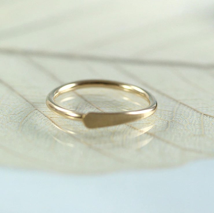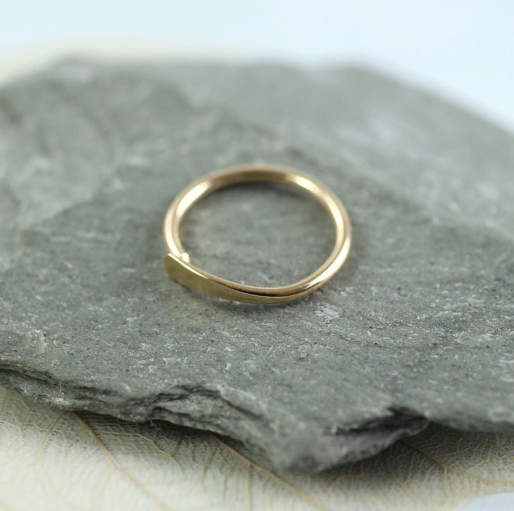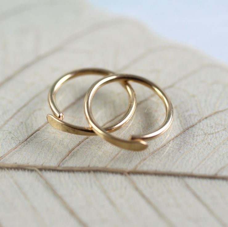Tiny golden sleeper hoop with a hammered overlap closure. The overlap means there's no catch.