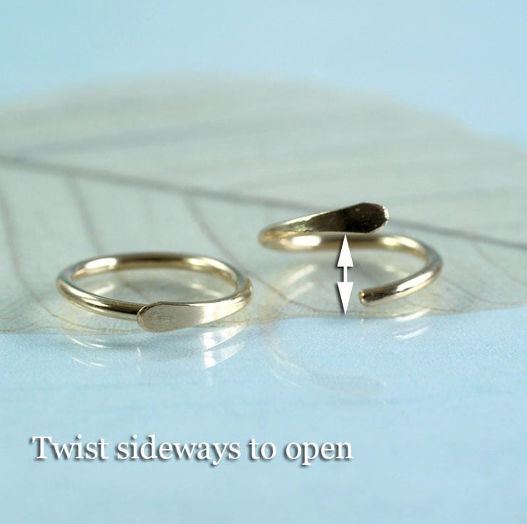 Twist sideways to open. That way you keep the perfect circle intact. These very small hoops can be tricky to get in, but they are really secure once on.