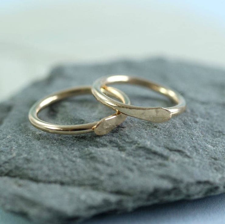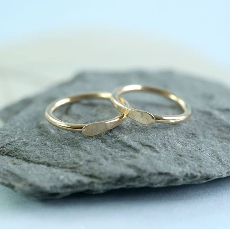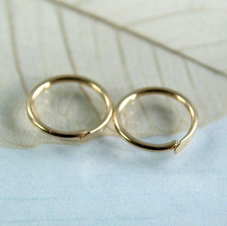 Tiny golden sleeper hoops with a hammered overlap closure. The overlap means there's no catch.