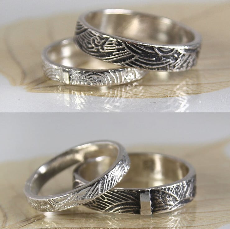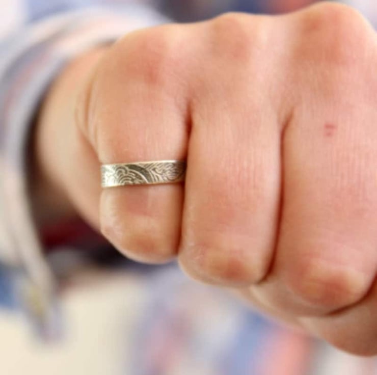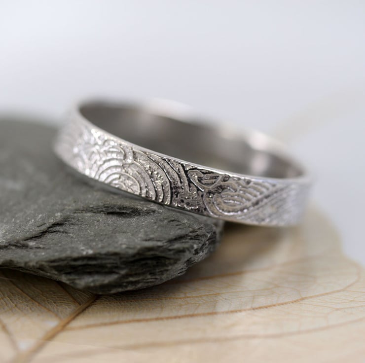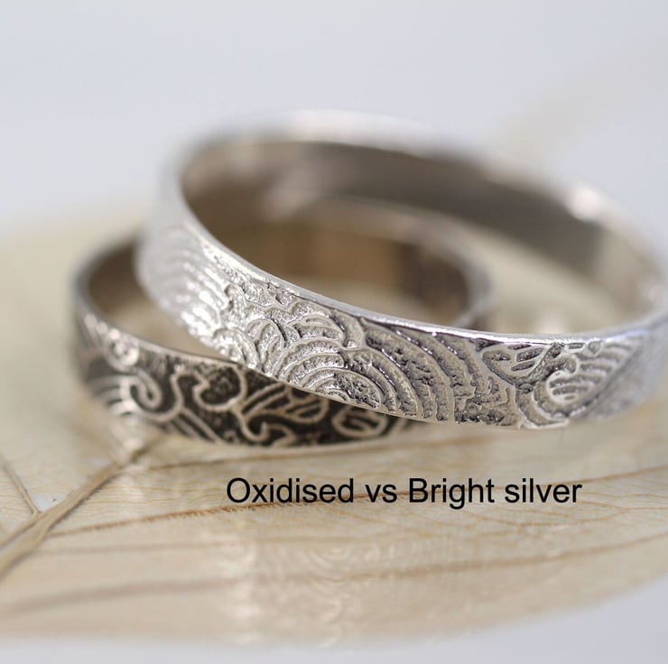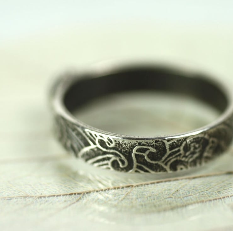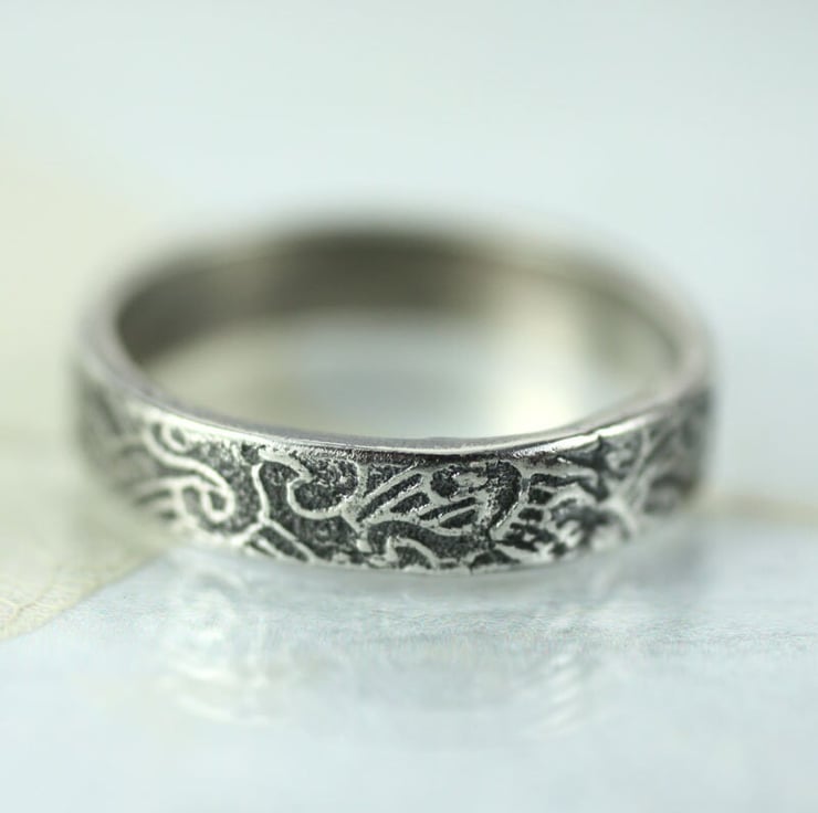 The sterling ring is imprinted with a handmade texture of swirly, frothy waves. I have oxidised it to emphasise the graphic pattern and then polished the ring to a high shine.