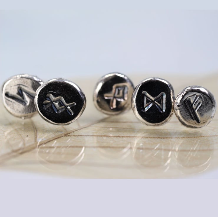 I have melted cut offs and scrap sterling into little nuggets. They were then hammered flat and a rune stamped into the face before adding the post to the back.