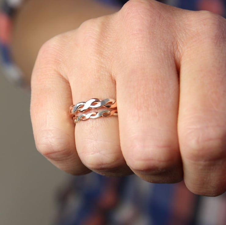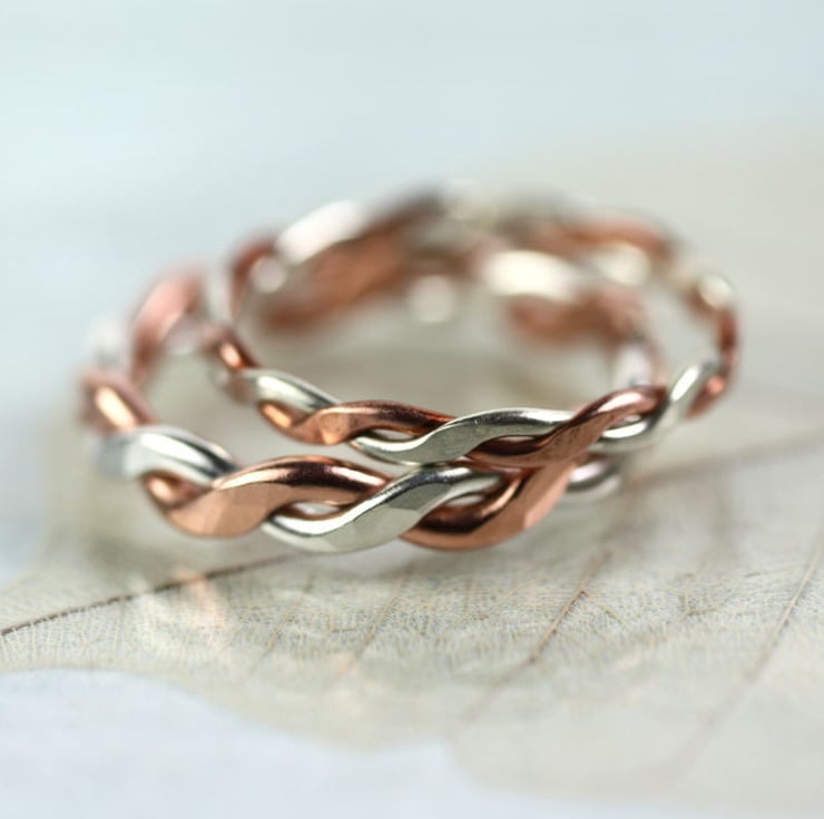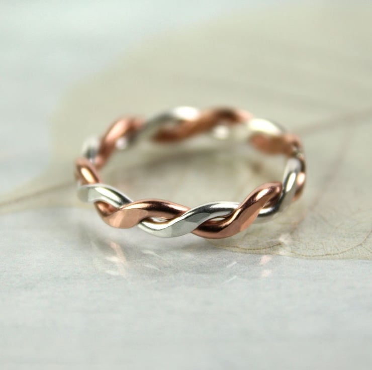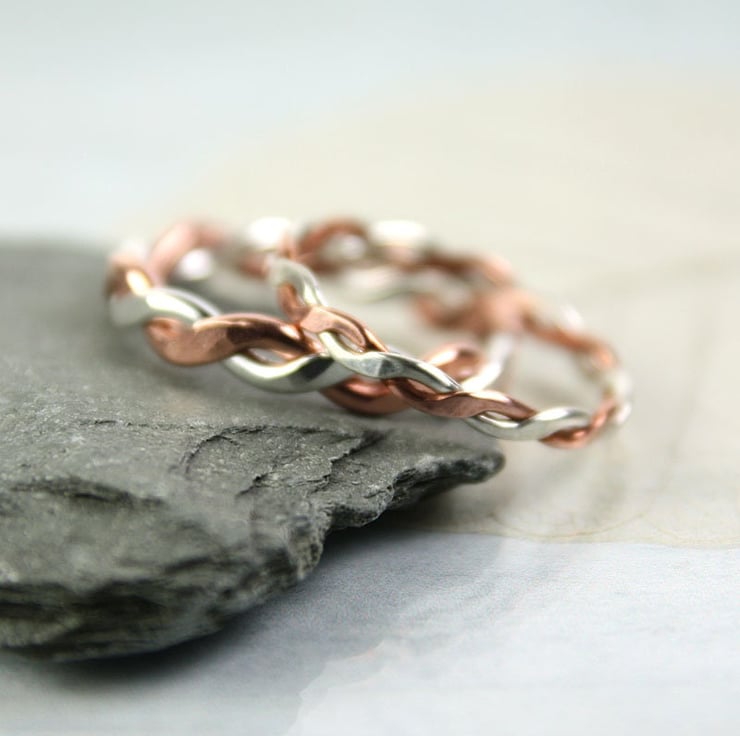 Sterling silver and copper entwined into a wire ring with twist detail hand forged in your size.