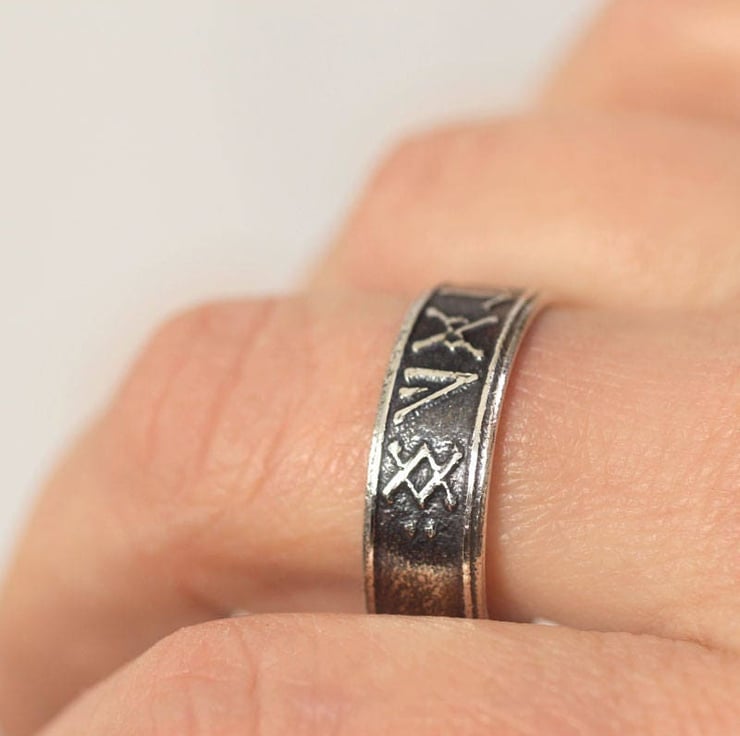 It is a 6-7 mm wide band - rustic, hand forged and oxidized to emphasize the runic scripture. I have then polished the high points to a shine. Each ring is made from a custom made texture plate imprinted with the runes.