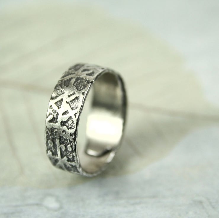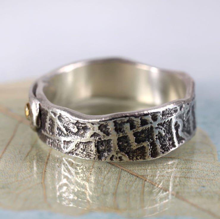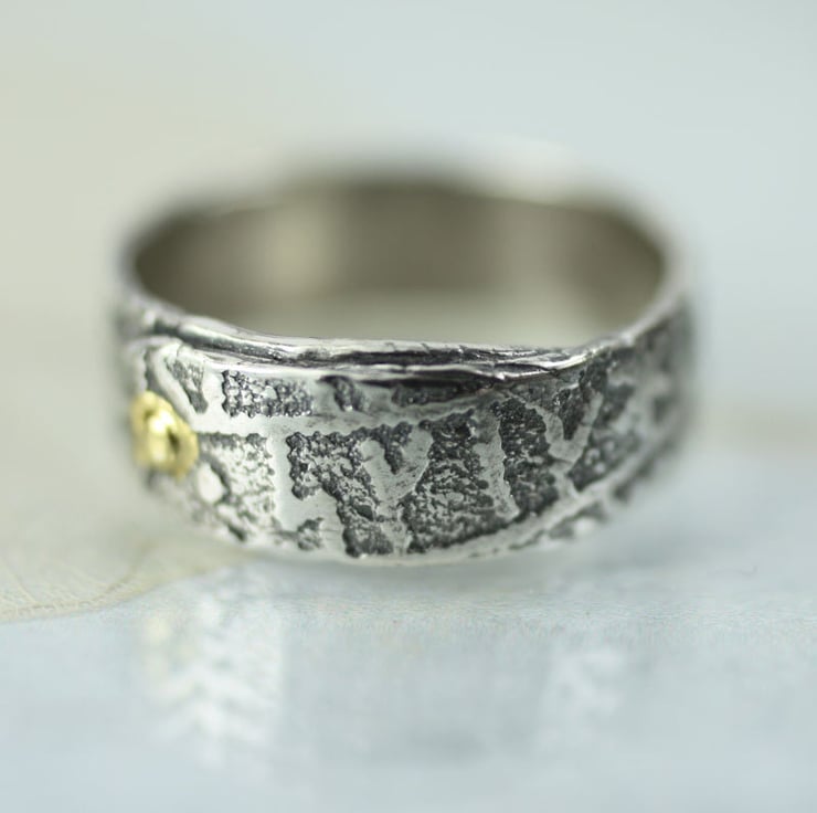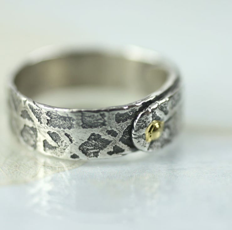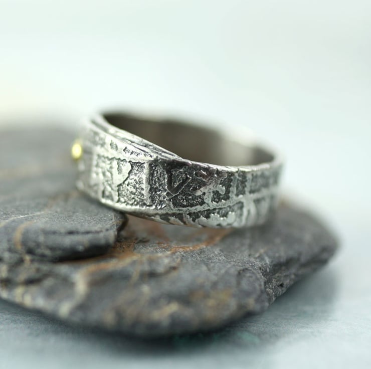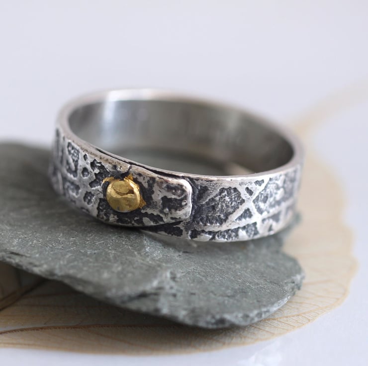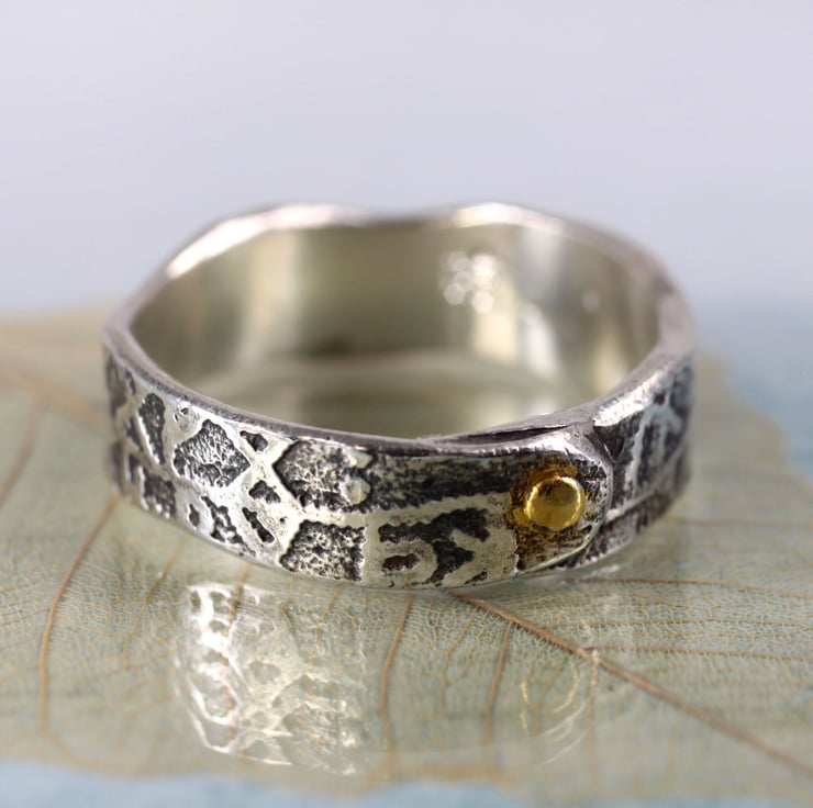 This ring is inspired by Vikings and tales of mischief. It is a 6 mm wide band - rustic, hand forged and oxidized to emphasise the runic scripture. I have then polished the high points to a shine. The ring band overlaps for a gorgeous rustic look and is 'held together' by a faux rivet embellished with 23.5k gold. The gold shines wonderfully and makes a great contrast to the oxidized silver.