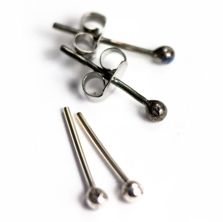 The balls on the posts are just 2 mm in diameter and the scroll backs are made from bright sterling silver.