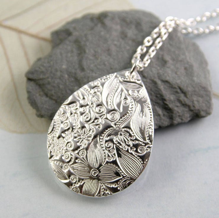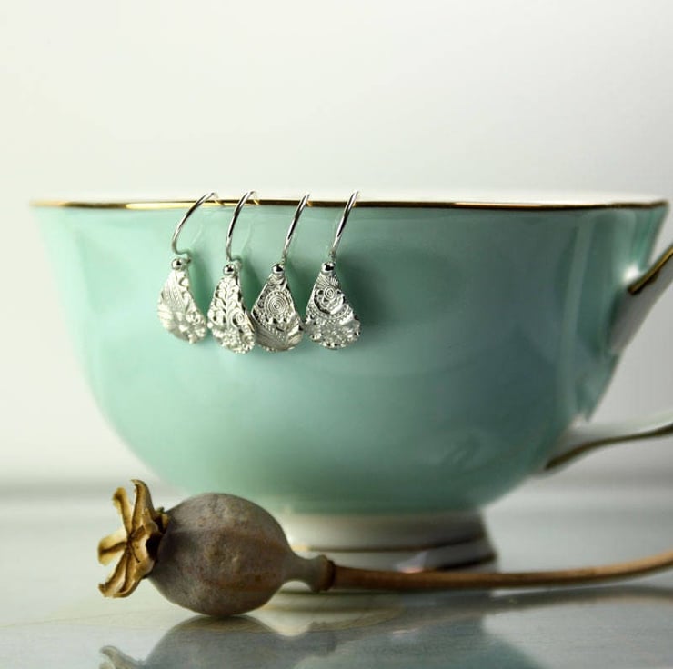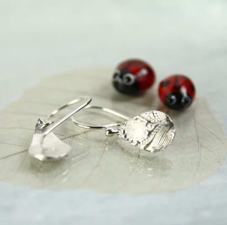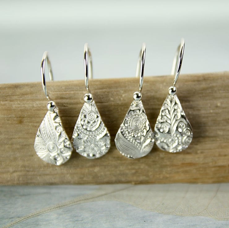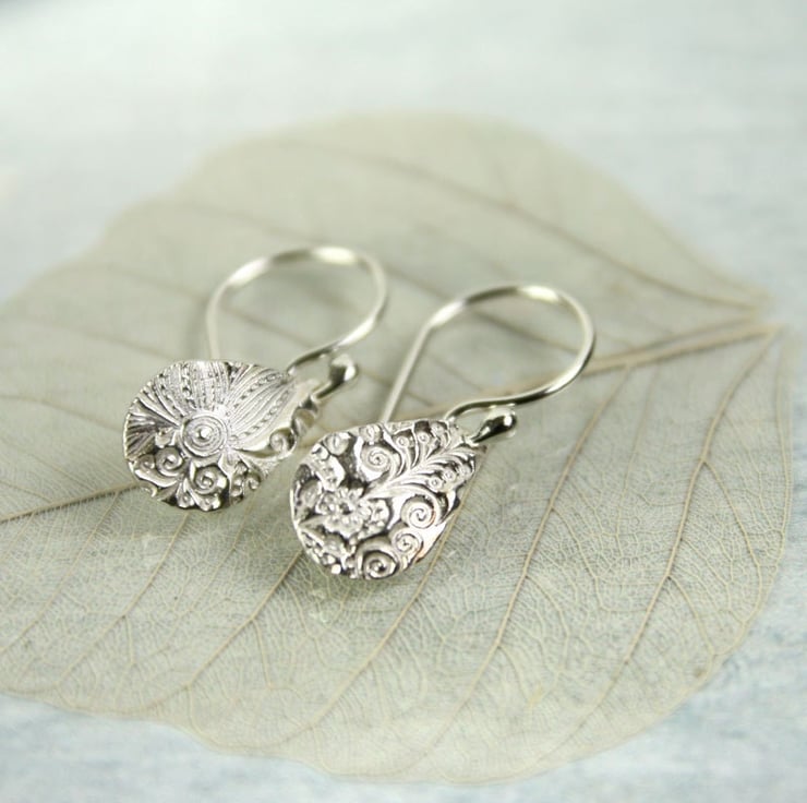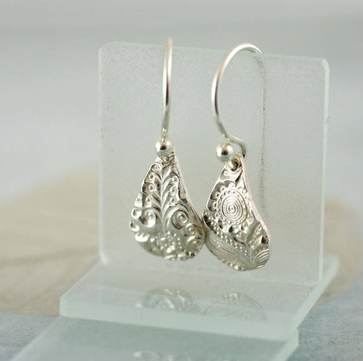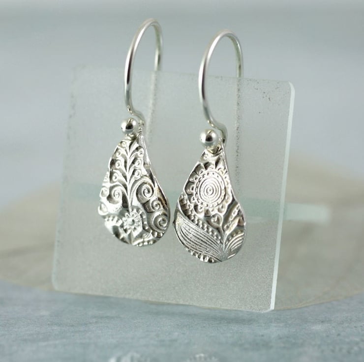 Dainty drop earrings made in recycled fine silver and impressed with a lovely flower, leaf and swirl pattern stamped into the metal.