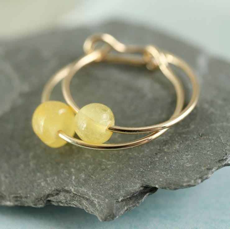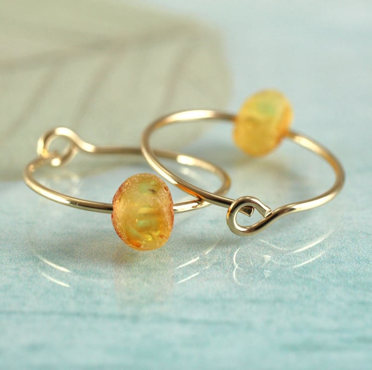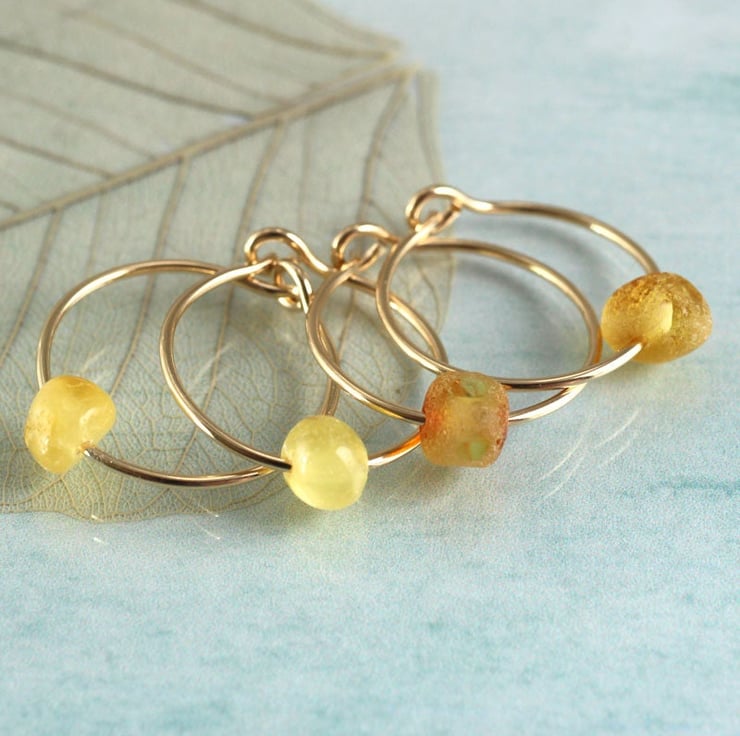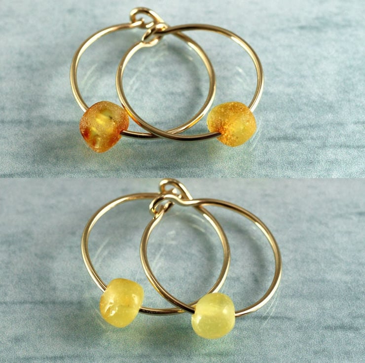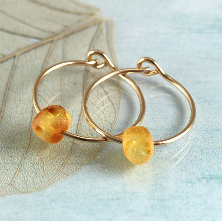 Round little unpolished amber beads in a lovely light syrup colour adorn these very popular 14 ct gold filled earring hoops with a simple closing mechanism. Just twist slightly to open.