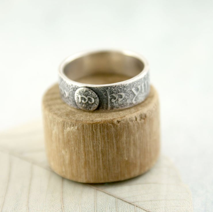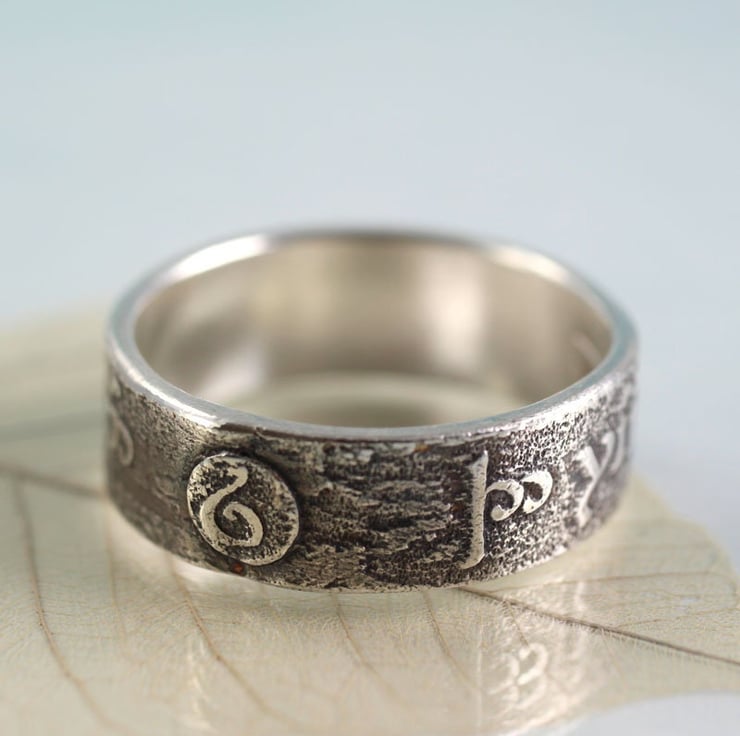 It is a sterling silver band 5-6 mm wide - rustic, hand-shaped and oxidised to emphasise the runic calligraphy. The letters shimmer on the darker background. Polished to a high shine and subtly adorned with a round rune plaque to finish the design.
