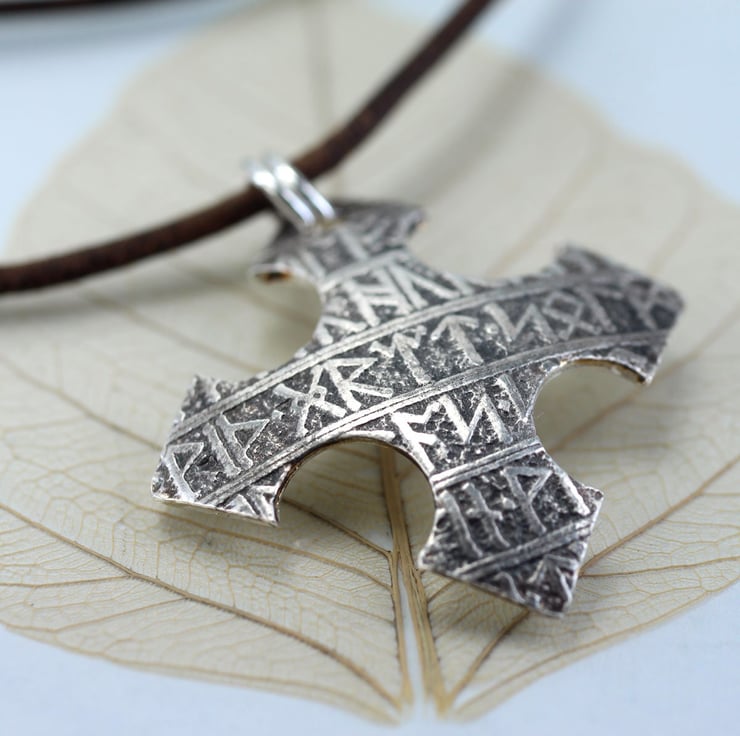 Viking Silver Cross Pendant with Rune Pattern - Necklace for Men