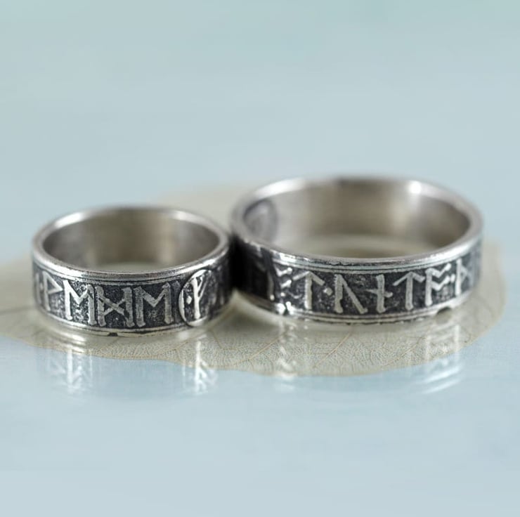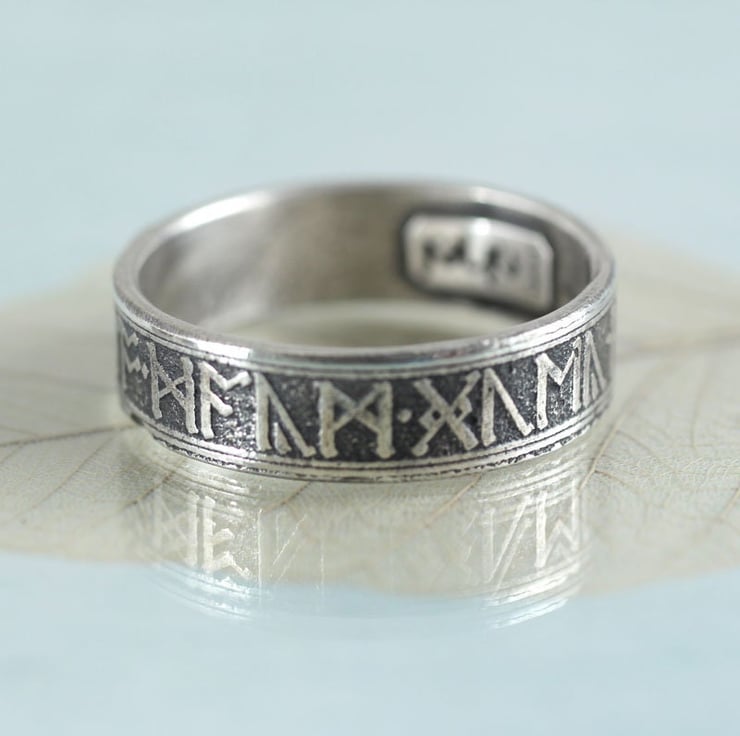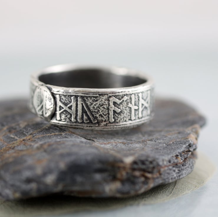 This ring is inspired by Vikings and tales of heroic kings. It is a 6 mm wide band - rustic, hand shaped and oxidized to emphasise the runic scripture.