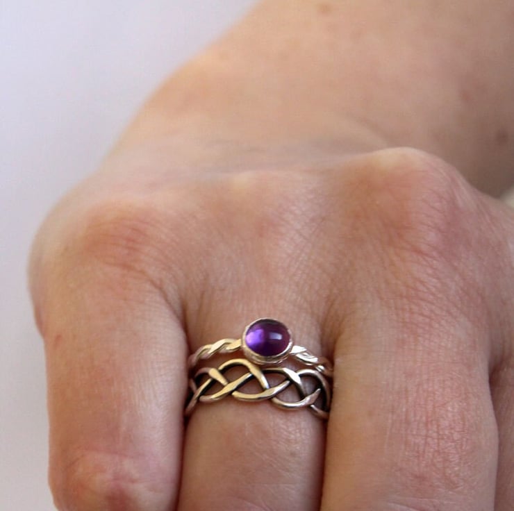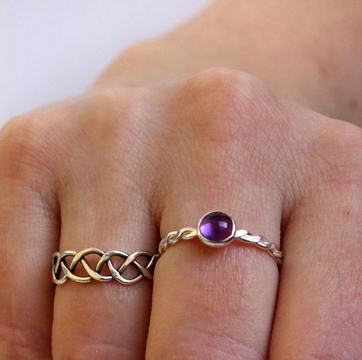 A delicate sterling silver ring with twist detail and lovely dark purple amethyst dome is hand forged in your size.