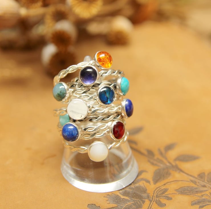 The ring is made from two sterling silver wires that have been twisted together by hand. I have hammered the wire, flattening it to make the twist stand out more and to make it more comfortable to wear. Then the setting was added and the stone chosen.