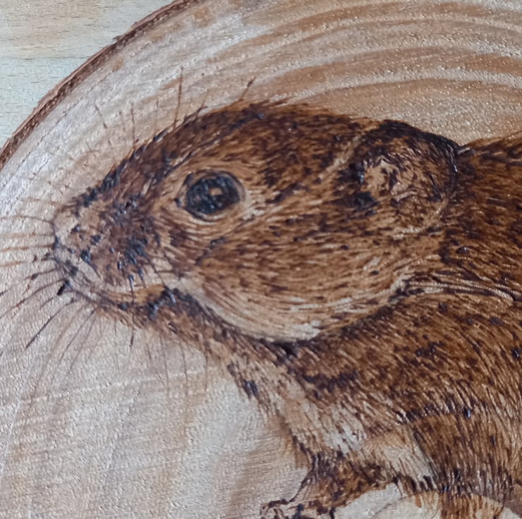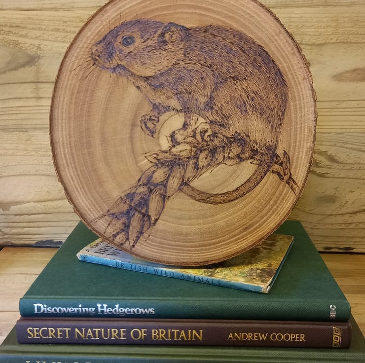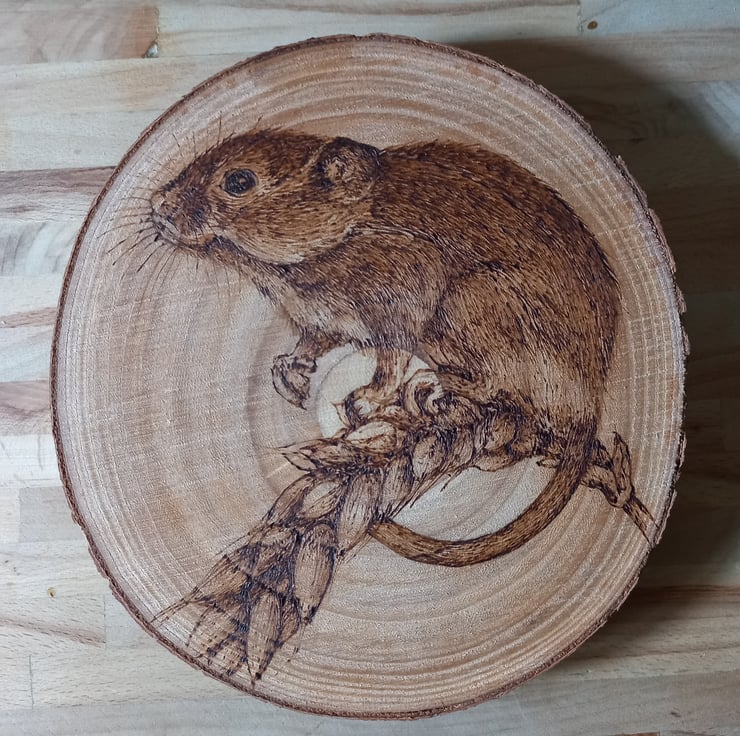 Wood slice illustrated with a Harvest Mouse using pyrography (wood burning).