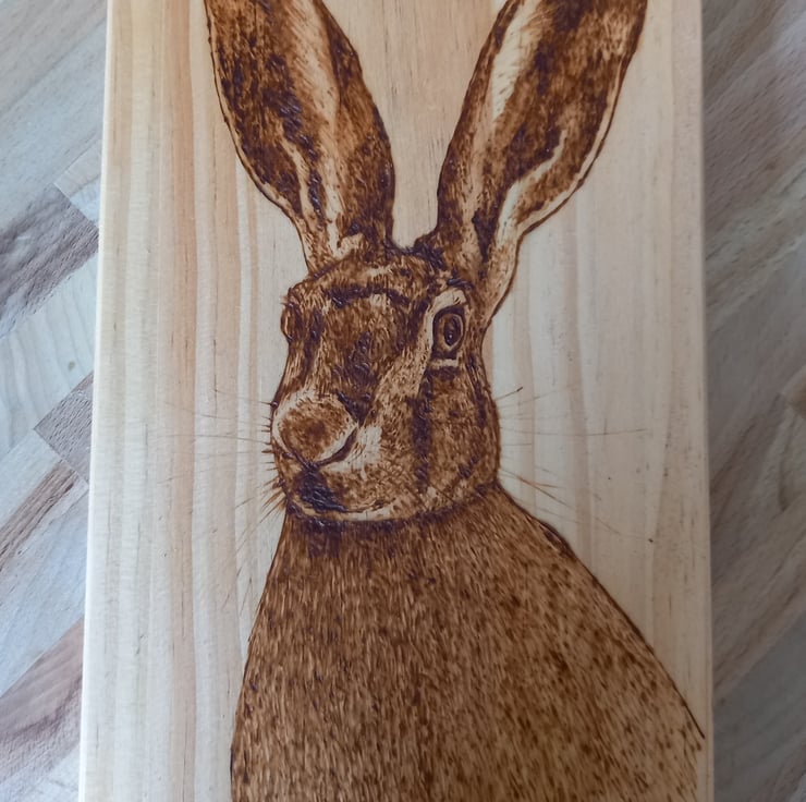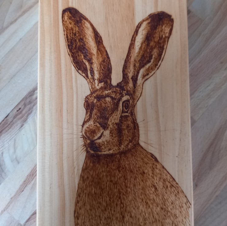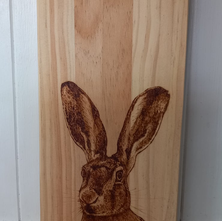 Large & long wooden board illustrated with a Hare using pyrography (wood burning).