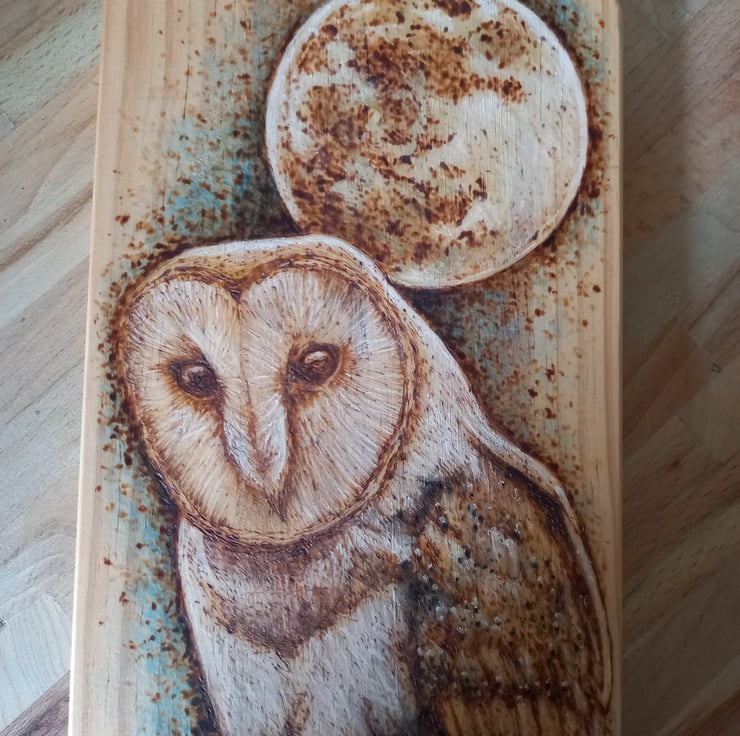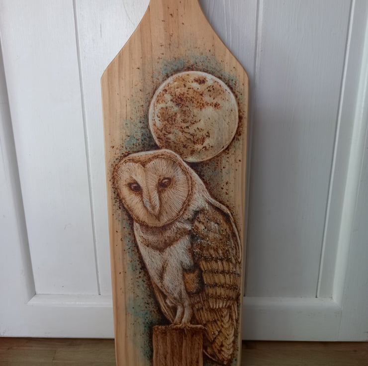 Large & long wooden board illustrated with a Barn Owl using pyrography (wood burning).