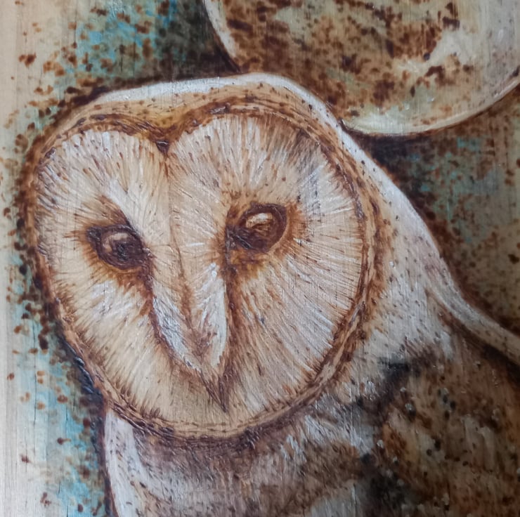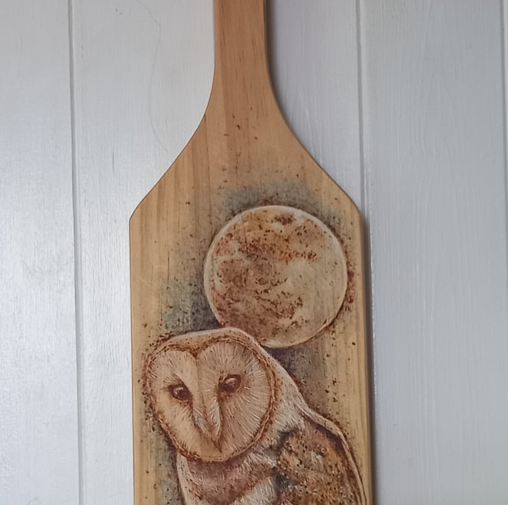 Large & long wooden board illustrated with a Barn Owl using pyrography (wood burning).