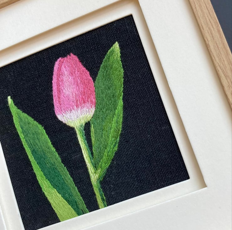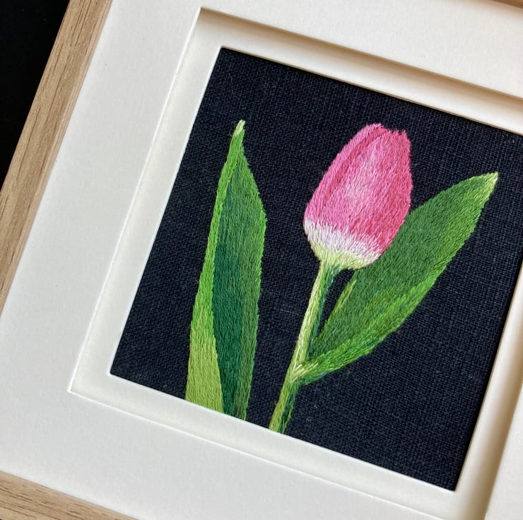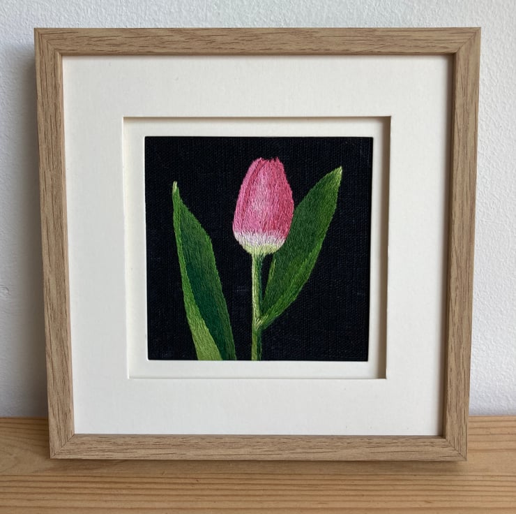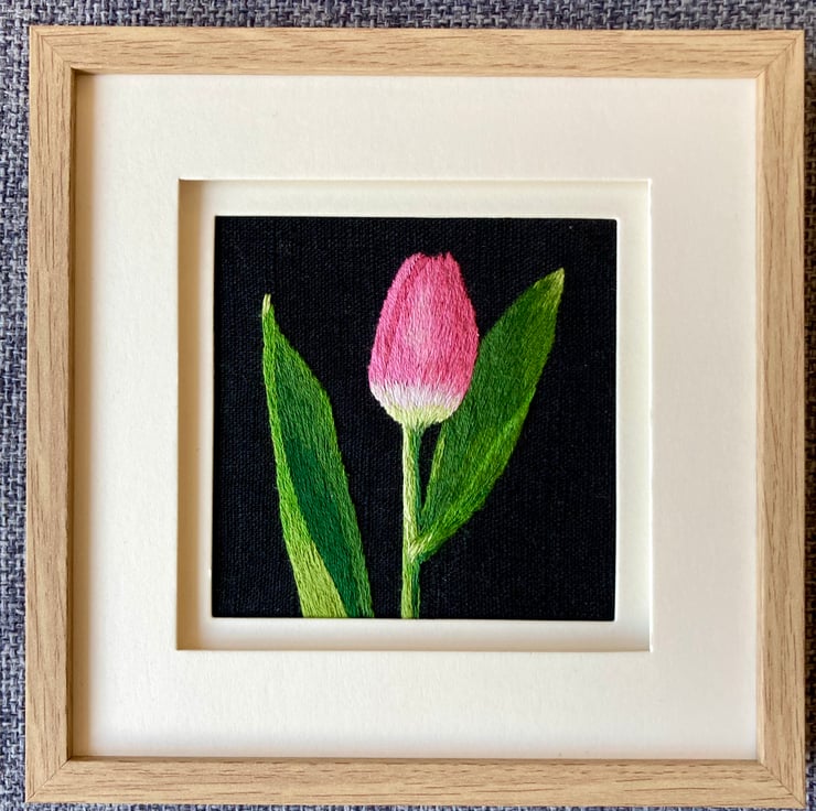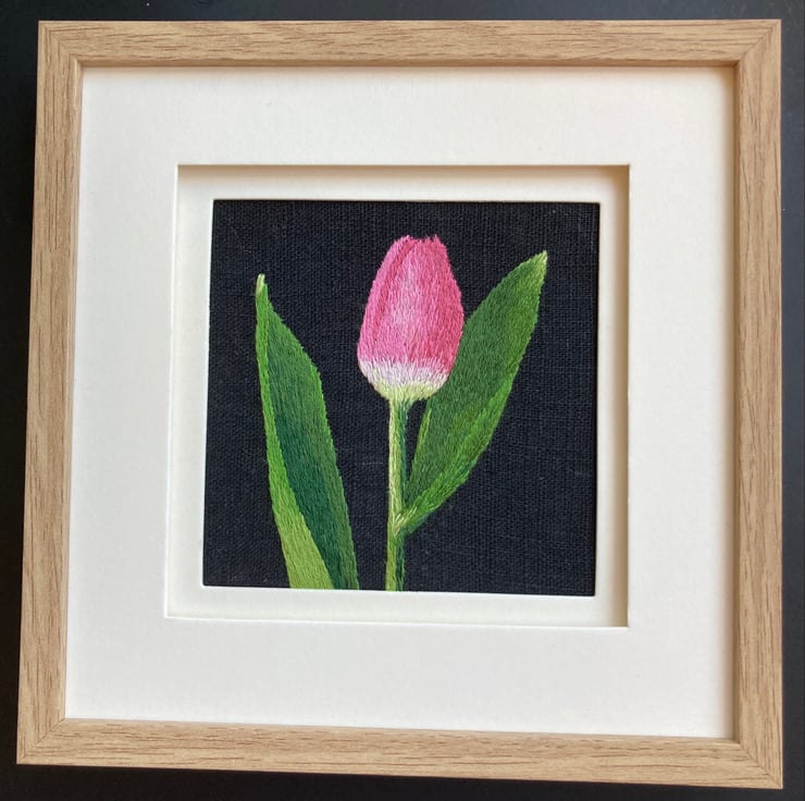 My brother took a photograph of a tulip. I really liked the image so I cropped it and used a black background to stitch on. I really like the simplicity of the image.